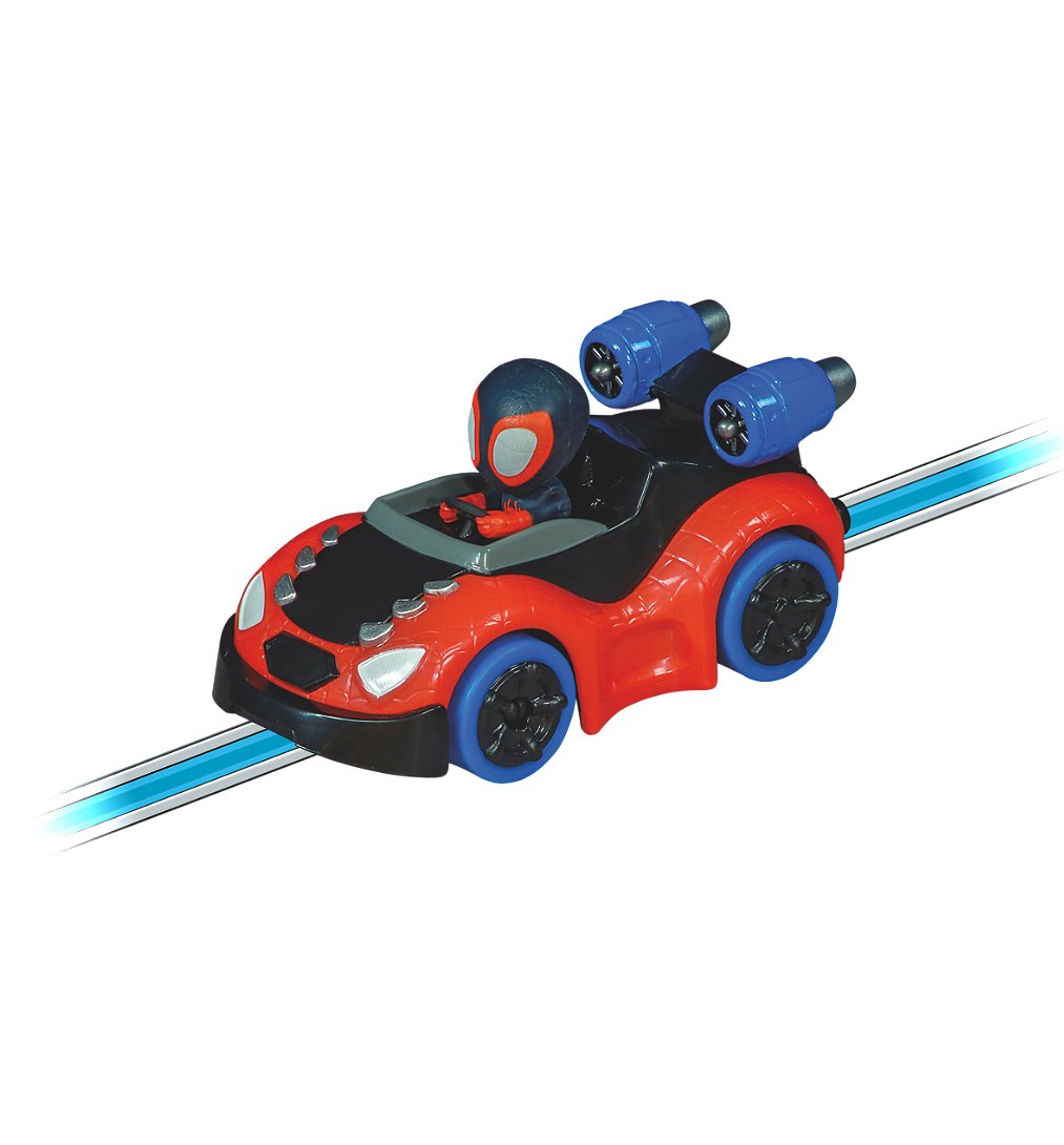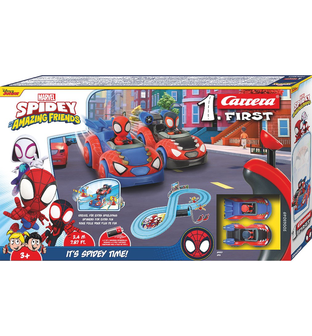 Circuit Carrera First sous licence Marvel avec Spidey et Spin. Longueur de piste : 2,9 m (échelle 1:50). Dès 3 ans : voitures qui restent sur les rails, manettes régulées électroniquement. Fonctionne avec 4 piles LR14 (non fournies). Inclus : 2 voitures, 2 manettes, décors, rétrécissement et éléments à bascule. Dimensions : 114 x 87 cm. Jusqu’à 2 joueurs.