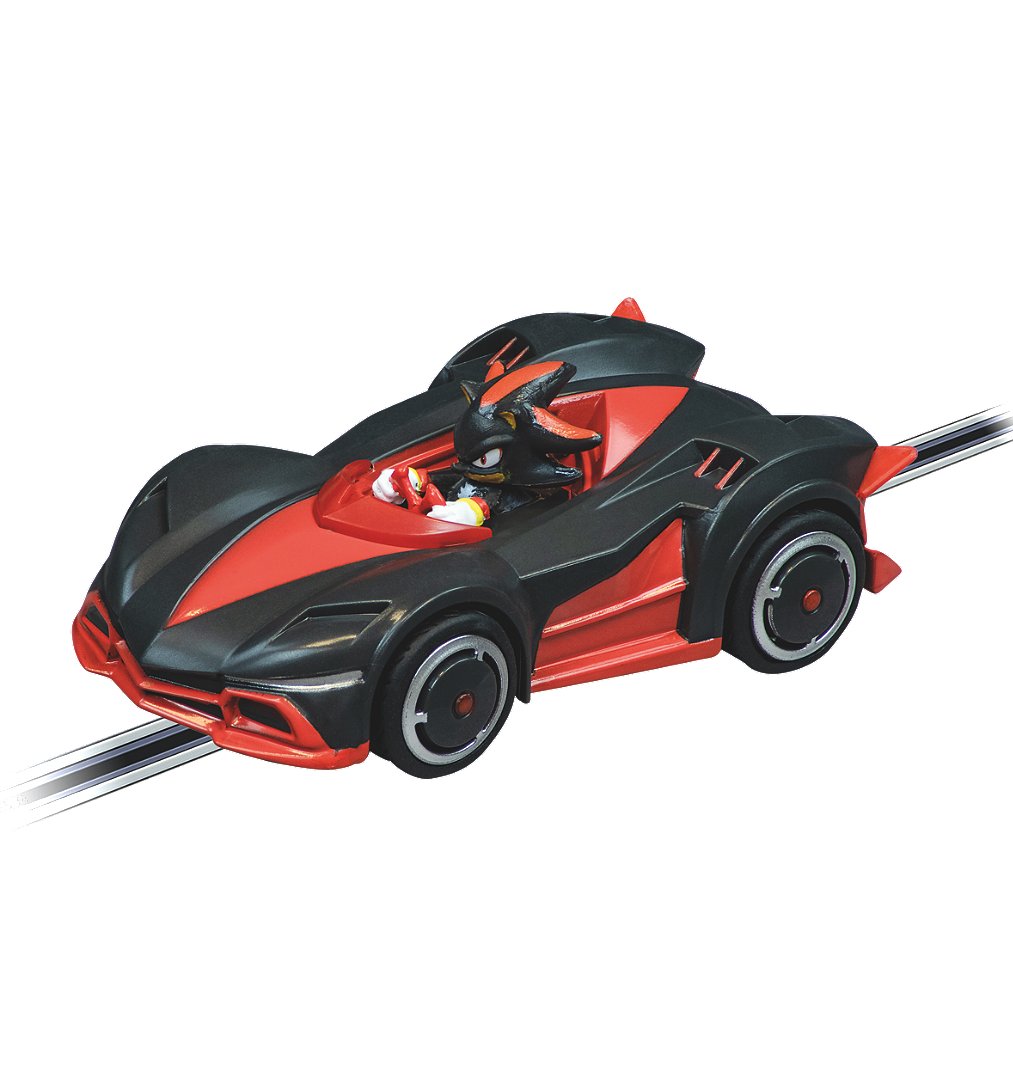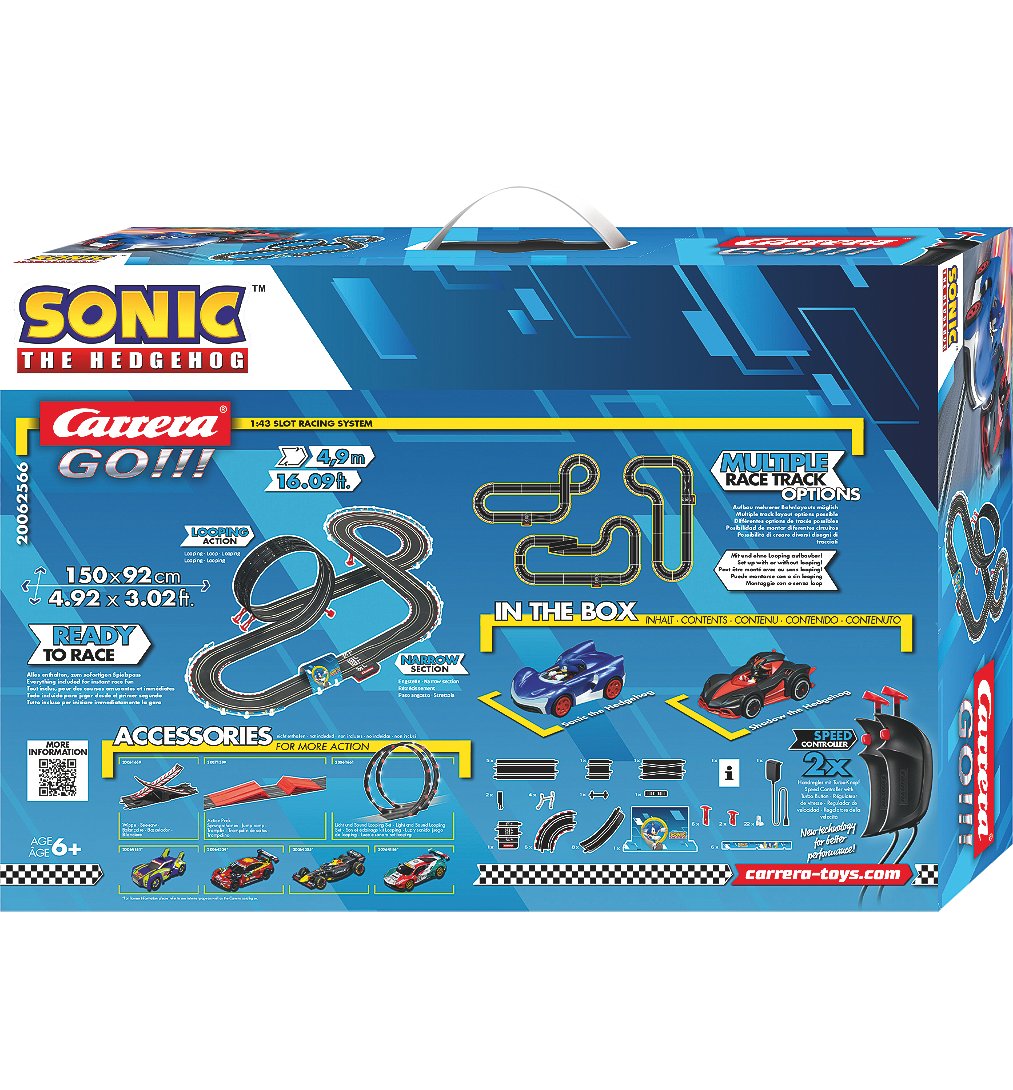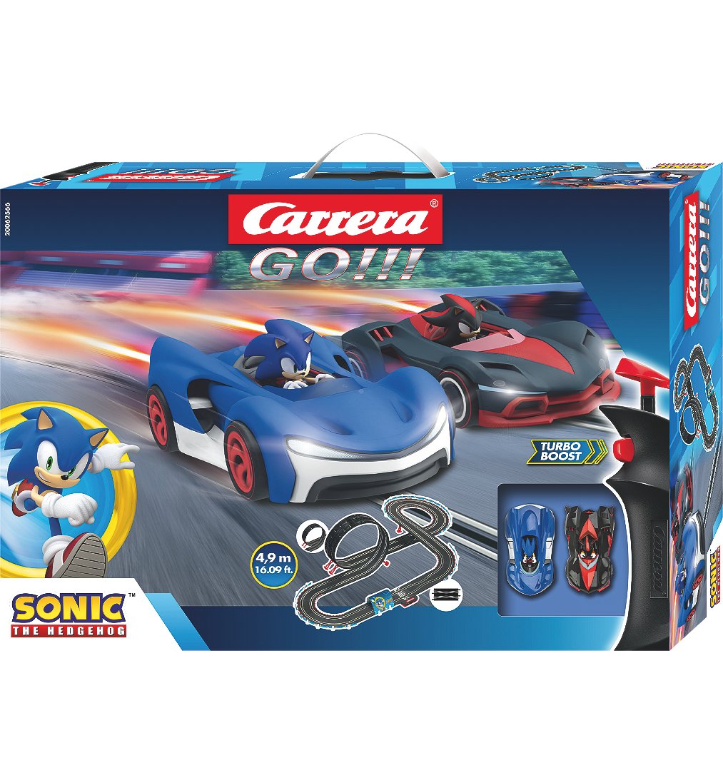 Circuit Carrera GO!!! sous licence officielle Sonic the Hedgehog. Sonic et Shadow s'affrontent à l’échelle 1:43 sur une piste de 4,9 m avec virages, looping et goulet d’étranglement. Inclus : 2 voitures, 2 manettes avec bouton turbo, compte-tours, rails, transformateur et éléments décoratifs. Dimensions monté : 150 x 92 cm. Jusqu’à 2 joueurs. Dès 6 ans.