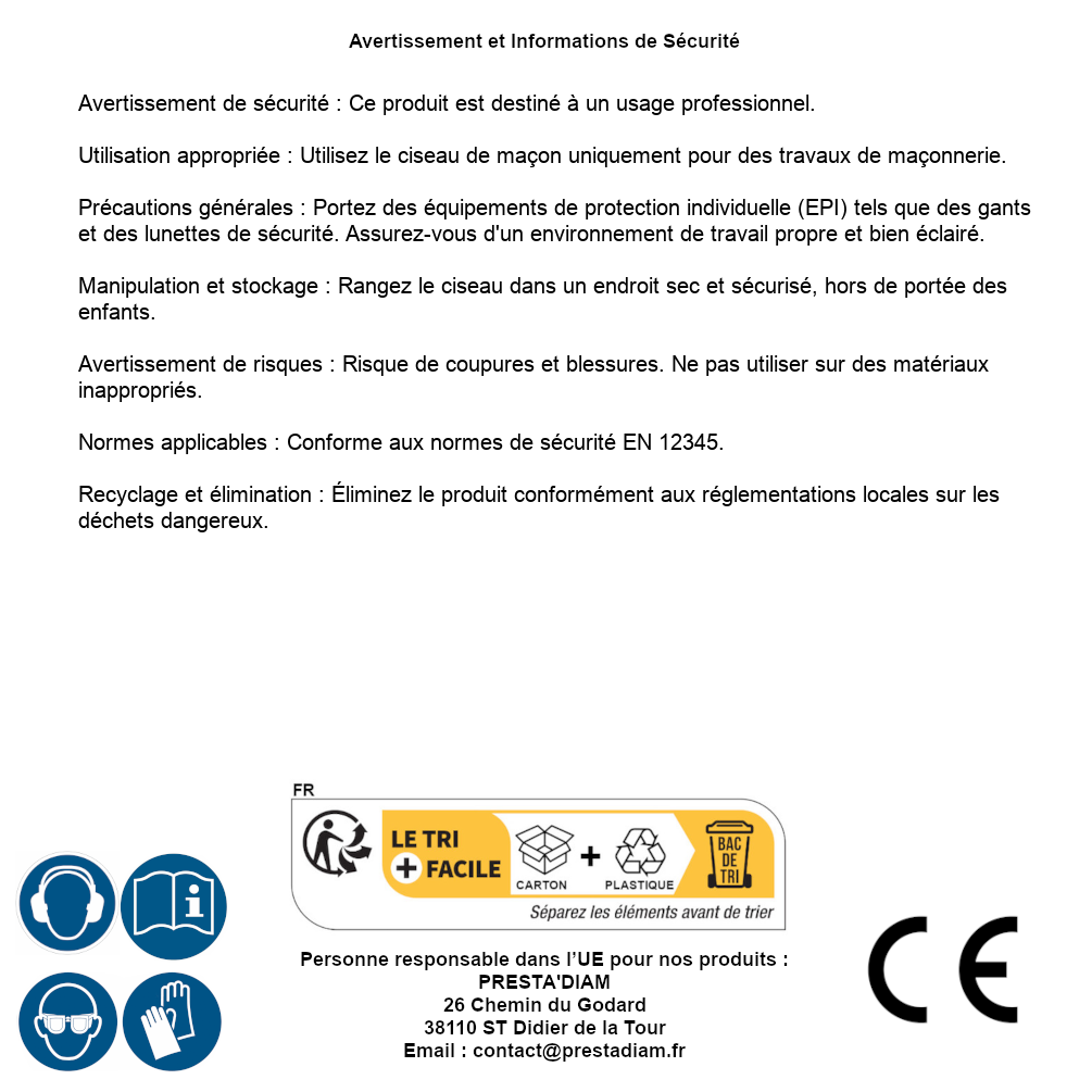 Entretien et nettoyagePour maintenir votre ciseau de maçon en bon état, nettoyez-le après chaque utilisation et appliquez une légère couche d'huile sur la lame pour prévenir la rouille.