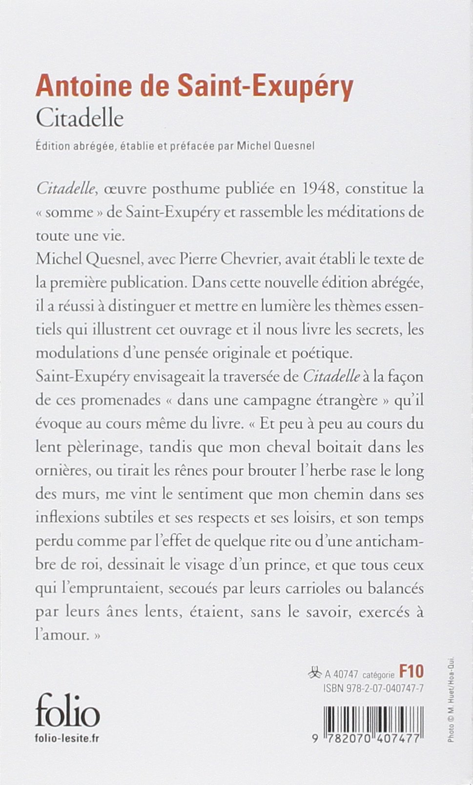 Citadelle, oeuvre posthume publiée en 1948, constitue la "somme" de Saint-Exupéry et rassemble les méditations de toute une vie. Michel Quesnel, avec Pierre Chevrier, avait établi le texte de la première publication. Dans cette nouvelle édition abrégée, il a réussi à distinguer et mettre en lumière les thèmes essentiels qui illustrent cet ouvrage et il nous livre les secrets, les modulations d'une pensée originale et poétique. Saint-Exupéry envisageait la traversée de Citadelle à la façon de ces promenades "dans une campagne étrangère" qu'il évoque au cours même du livre. "Et peu à peu au cours du lent pèlerinage, tandis que mon cheval boitait dans les ornières, ou tirait les rênes pour brouter l'herbe rase le long des murs, me vint le sentiment que mon chemin dans ses inflexions subtiles et ses respects et ses loisirs, et son temps perdu comme par l'effet de quelque rite ou d'une antichambre de roi, dessinait le visage d'un prince, et que tous ceux qui l'empruntaient, secoués par leurs carrioles ou balancés par leurs ânes lents, étaient, sans le savoir, exercés à l'amour."