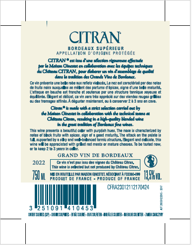 | Libellé | Citran, 2022 - Bordeaux Supérieur AOP - Rouge - 75 cl |