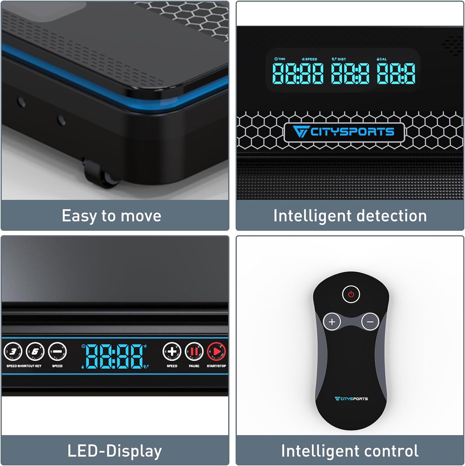 ✅︎ Contrôle intelligent : le tapis de course est équipé d'une télécommande intelligente sans fil, une clé pour démarrer facilement le tapis de course, le tapis de course a également l'APP de la marque, pour réaliser l'interaction en temps réel et la visualisation des téléphones mobiles, les données du tapis de course, l'audio bluetooth de sorte que votre exercice n'est plus ennuyeux.