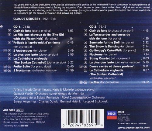Le double album au titre évocateur \"Clair de lune\" concentre les oeuvres les plus célèbres du compositeur. Rêve et poésie sont au rendez-vous, une musique aux accents impressionnistes car inspirée par la nature et forgée par une technique propre à Debussy : harmonies flottantes et chatoyantes, mélodies aux contours non définis, subtilité des rythmes intérieurs. Voici donc le meilleur de Debussy, introduit par ce qui est certainement le plus grand tube du compositeur, Clair de lune, en version pour piano seul (CD1) et son arrangement pour orchestre (CD2). Suivent d'autres pièces pour piano célèbres dont La fille aux cheveux de lin et La cathédrale engloutie. Incontournables dans le répertoire pour orchestre, on retrouvera Le Prélude à l'après-midi d'un faune, Nocturnes ainsi que La Mer dont l'exécution intégrale clôt triomphalement la compilation.