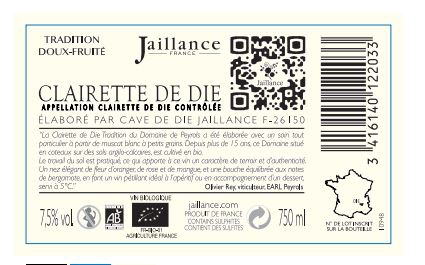 | Libellé | Clairette de Die AOP Domaine de Peyrols Tradition BIO - Brut - 75 cl |