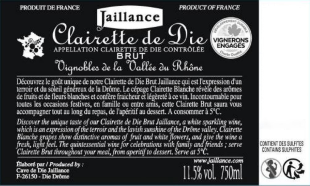 | Libellé | Clairette de Die AOP Jaillance - Brut - 75 cl |