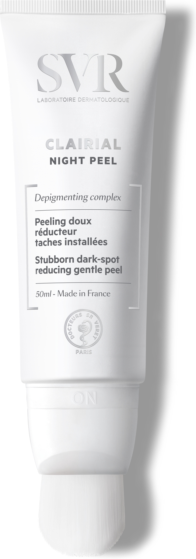 SVR Clairial Night Peel 50 ml est un soin peeling doux qui corrige toutes taches pigmentaires naissantes, récentes ou installées. Son enzyme végétale affine la surface de la peau pour restaurer uniformité et éclat. Sa formule réconfortante booste la récupération de l'épiderme pour une peau reposée comme après une bonne nuit de sommeil. Nuit après nuit, la peau est souple, lisse et homogène. Il possède des actifs dermatologiques à hautes doses : - complément dépigmentant qui estompe et réduit les tâches, - enzyme végétale qui exfolie et accélère la dépigmentation, - Niacinamide et levures anti-stress qui dynamisent la capacité de récupération de la barrière cutanée.