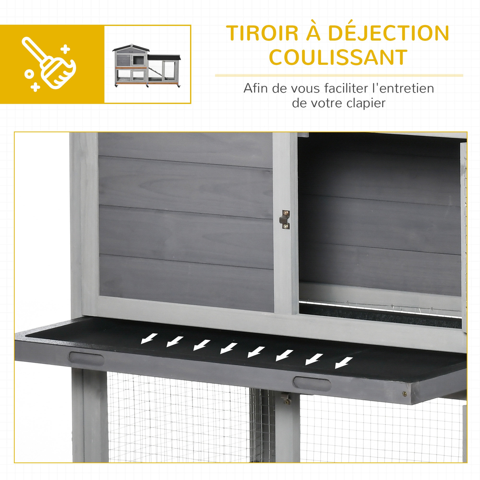- 2 tiroirs à déjection coulissants afin de vous faciliter l'entretien de votre clapier pour le bien-être de vos animaux