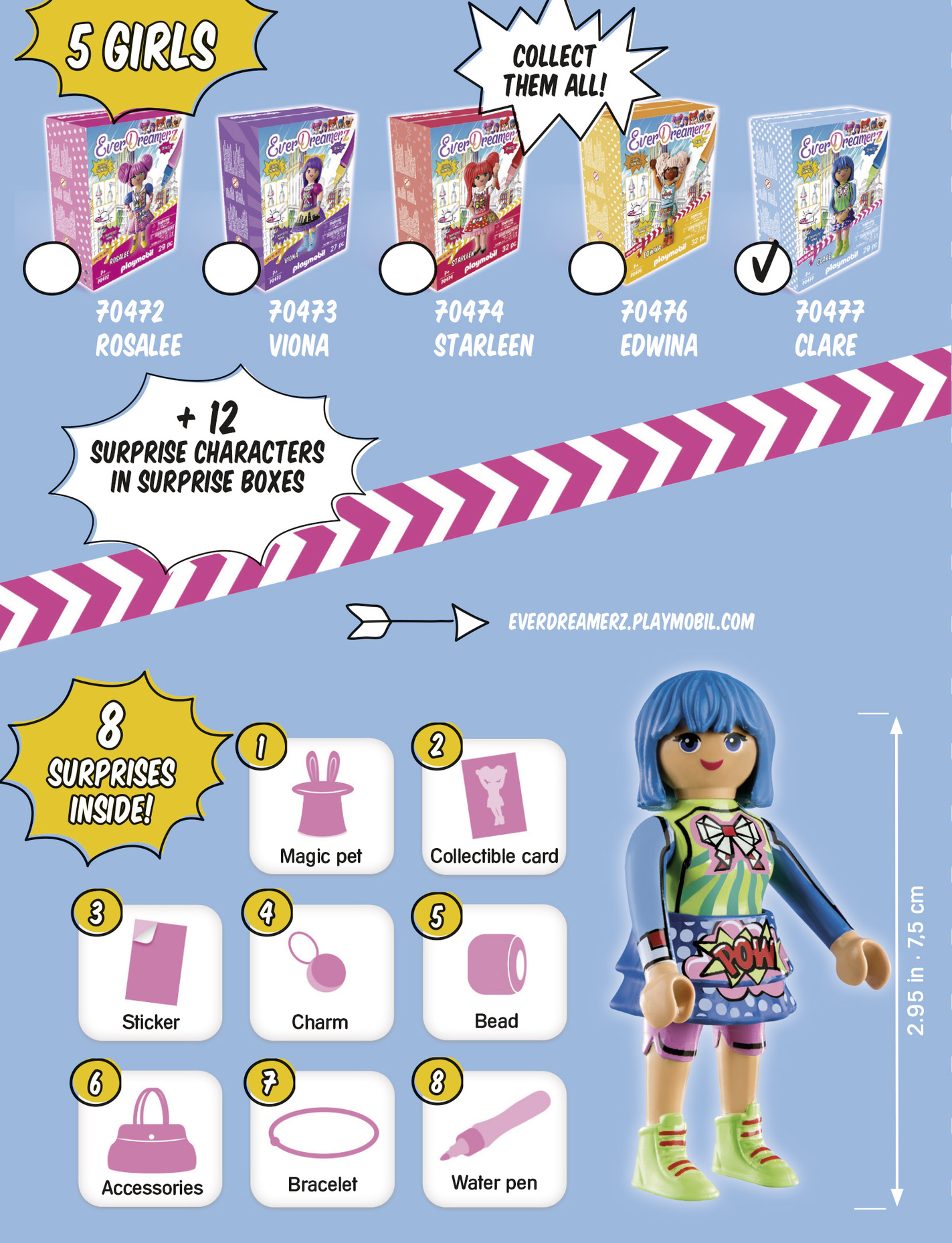 Les aventures des Everdreamerz débutent par la découverte d'une amulette mystérieuse leur permettant de voyager au pays de leurs rêves. Les cinq héroïnes Rosalee, Viona, Edwina, Clare et Starleen vont vivre des aventures extraordinaires. Plus soudées que jamais elles vaincront ensemble tous les dangers. Clare est le génie du groupe, aucune situation difficile ne lui résiste, elle trouve toujours la solution ! Passionnée de géométrie, elle crée des origamis personnalisés. Contient un bracelet, des perles, un pinceau, une carte à collectionner, des autocollants et de nombreux accessoires. Les autocollants peuvent être décorés avec le nouveau feutre à eau PLAYMOBIL.