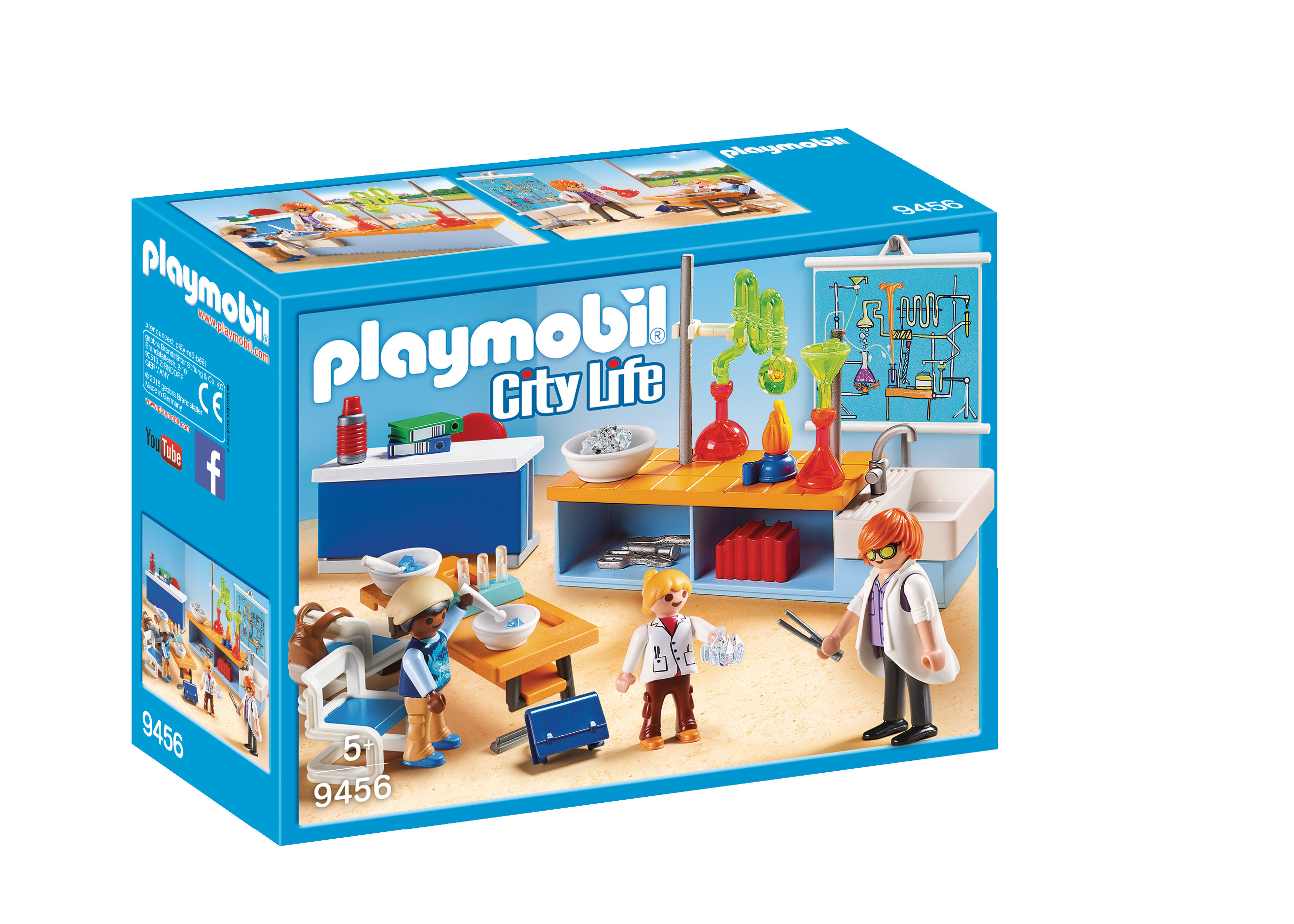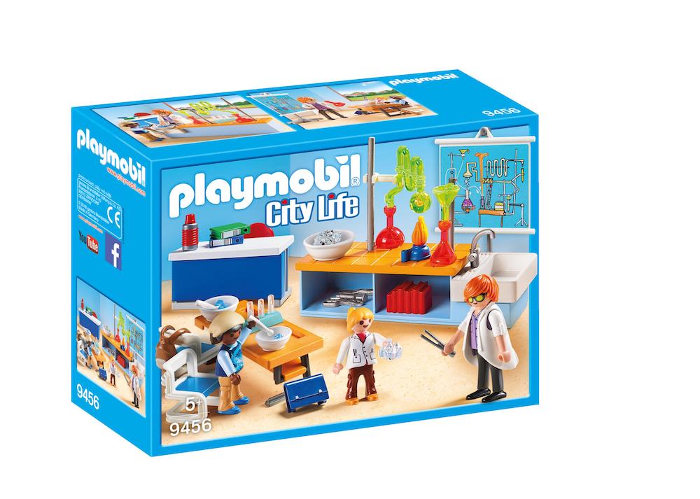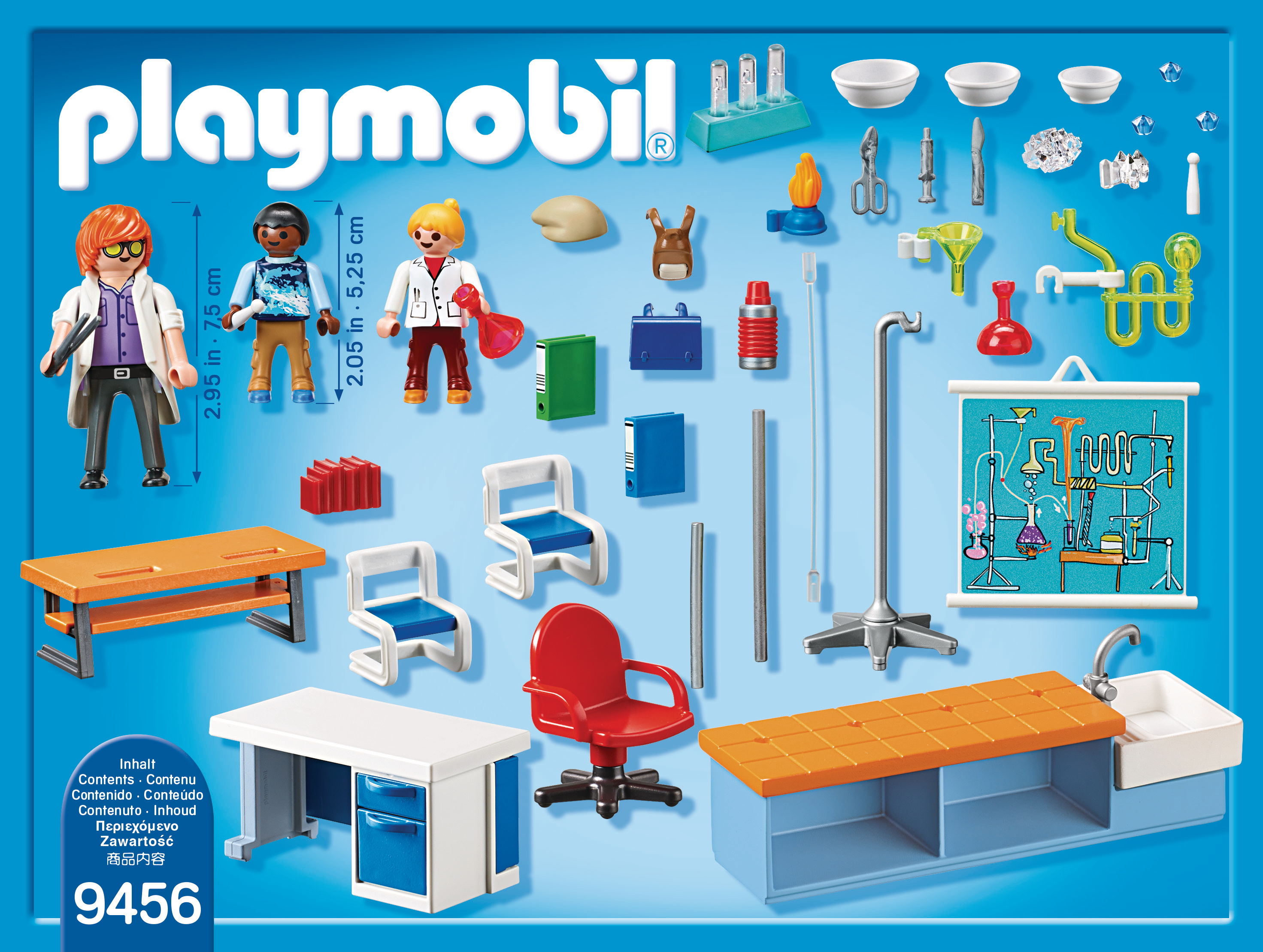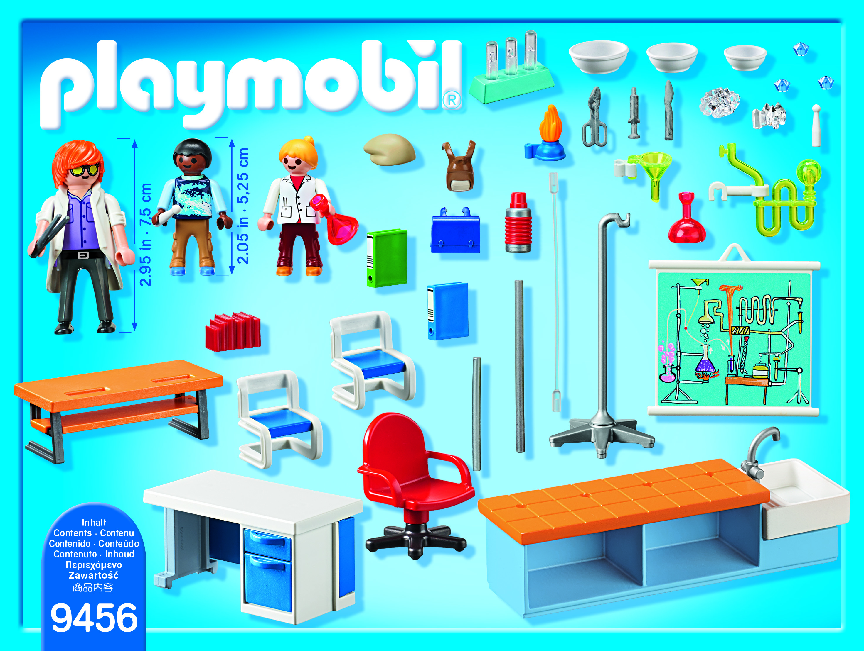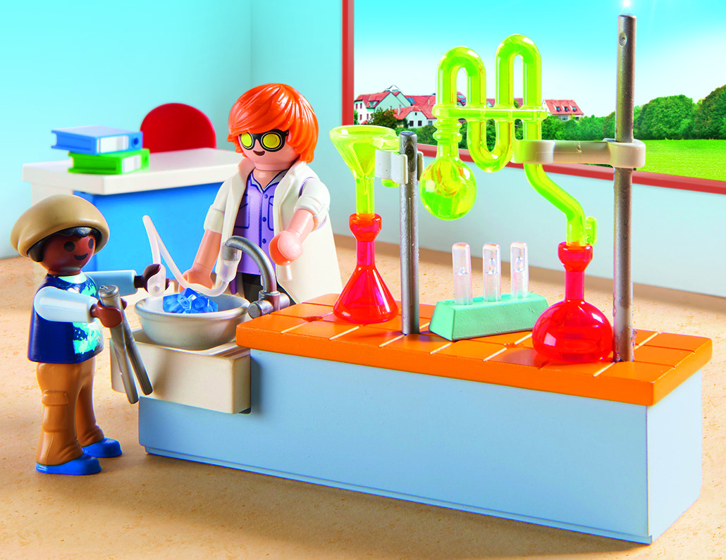 Avec trois personnages, du mobilier et du matériel pour les expériences (tube à essais, bols, outils, livres)