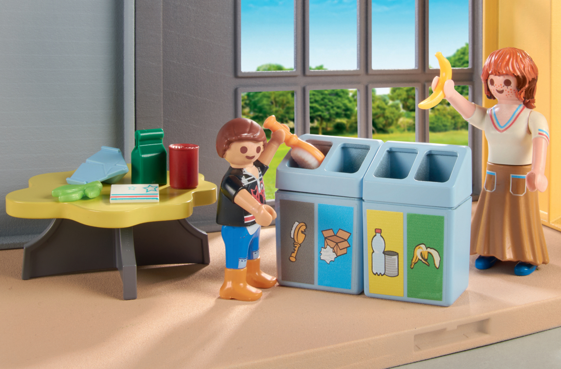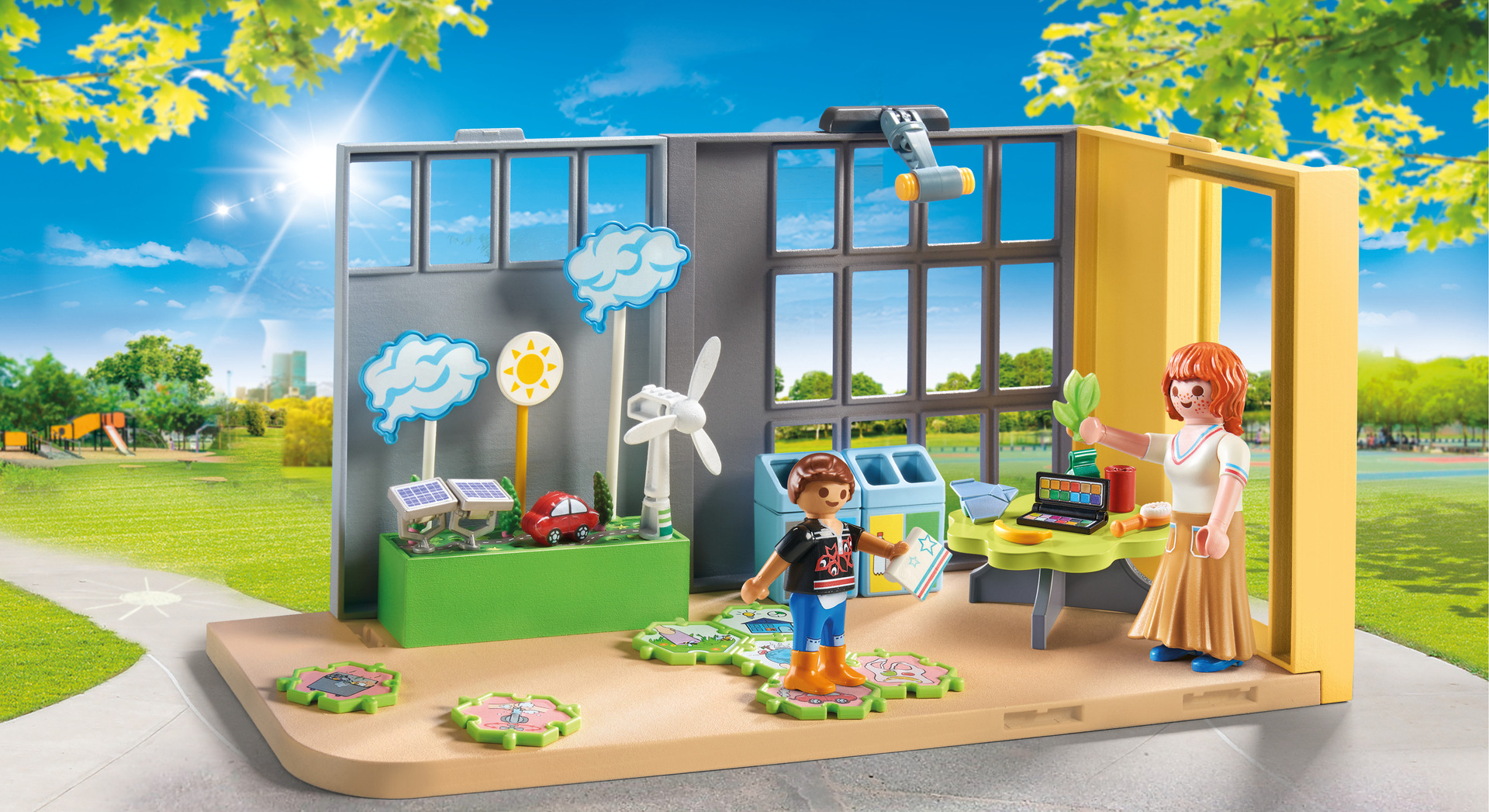 | Plus produit | Avec une enseignante et un écolier. \nComprend des accessoires pédagogiques sur les énergies renouvelables et des bacs pour apprendre le tri sélectif. \nUn jeu sous forme de puzzle est inclus, pour découvrir les bonnes pratiques. |