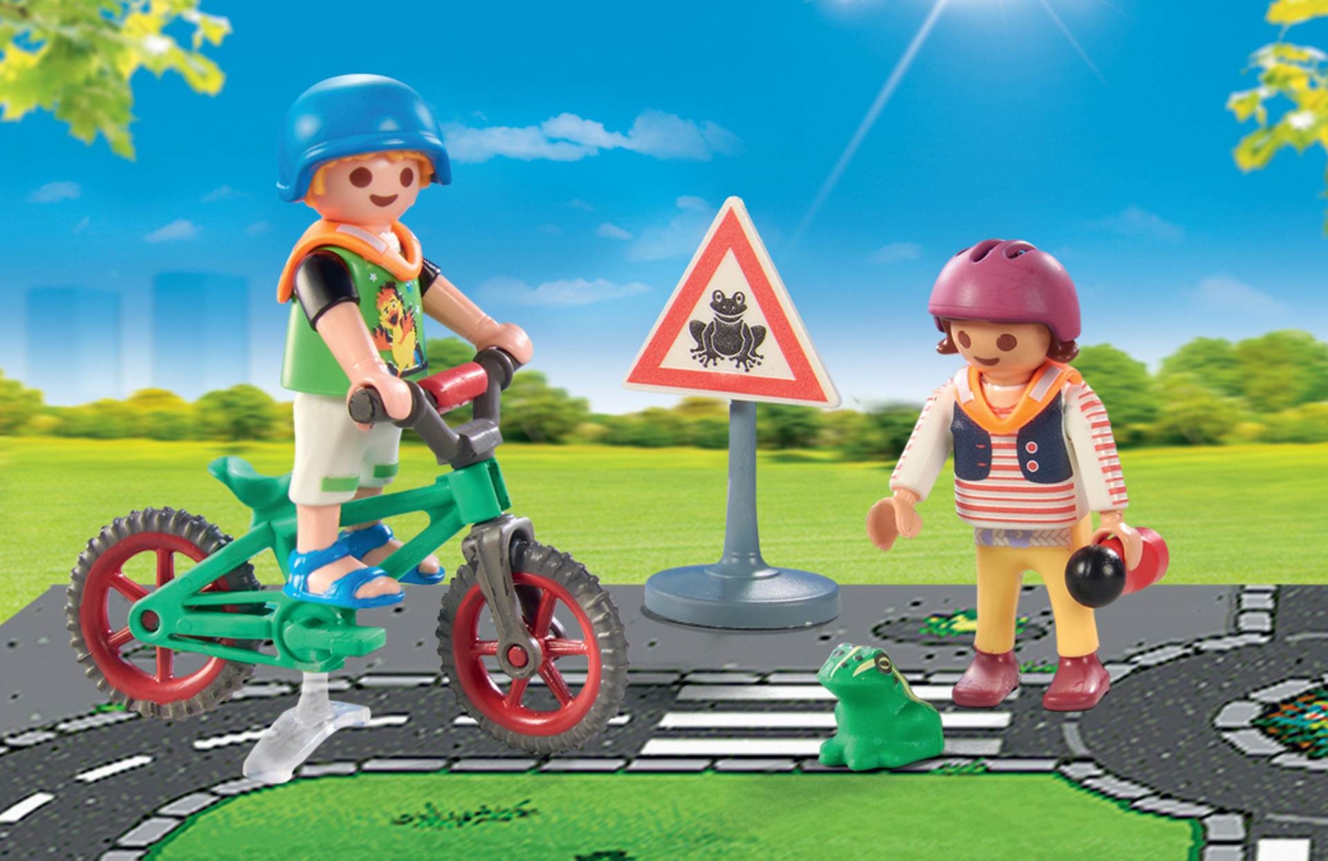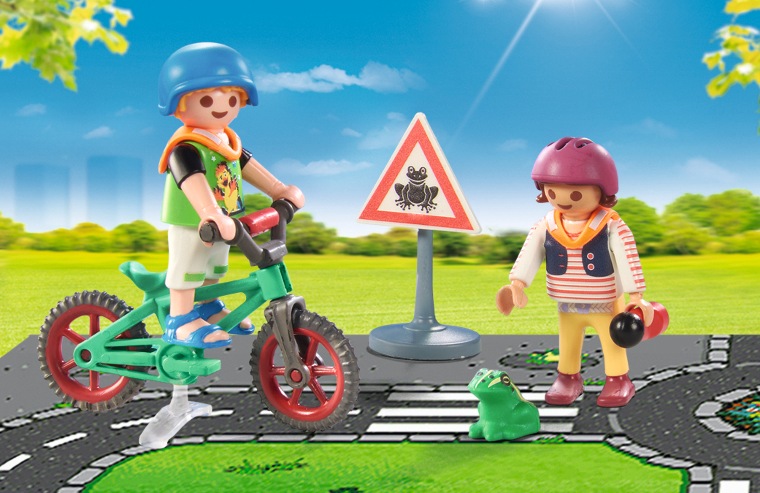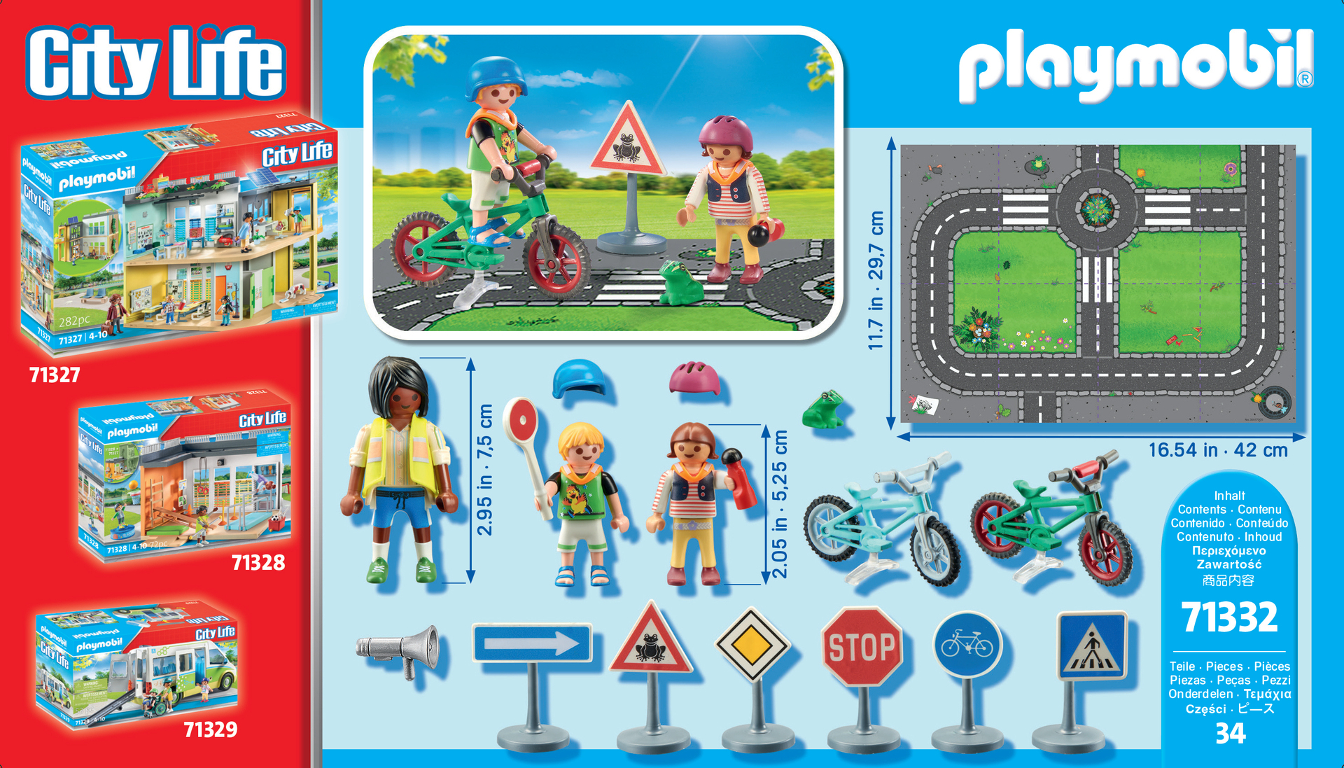 | Plus produit | Avec une enseignante et deux enfants à vélos. Comprend un tapis de jeu avec motif de route. Plusieurs panneaux de circulation pour apprendre les r |