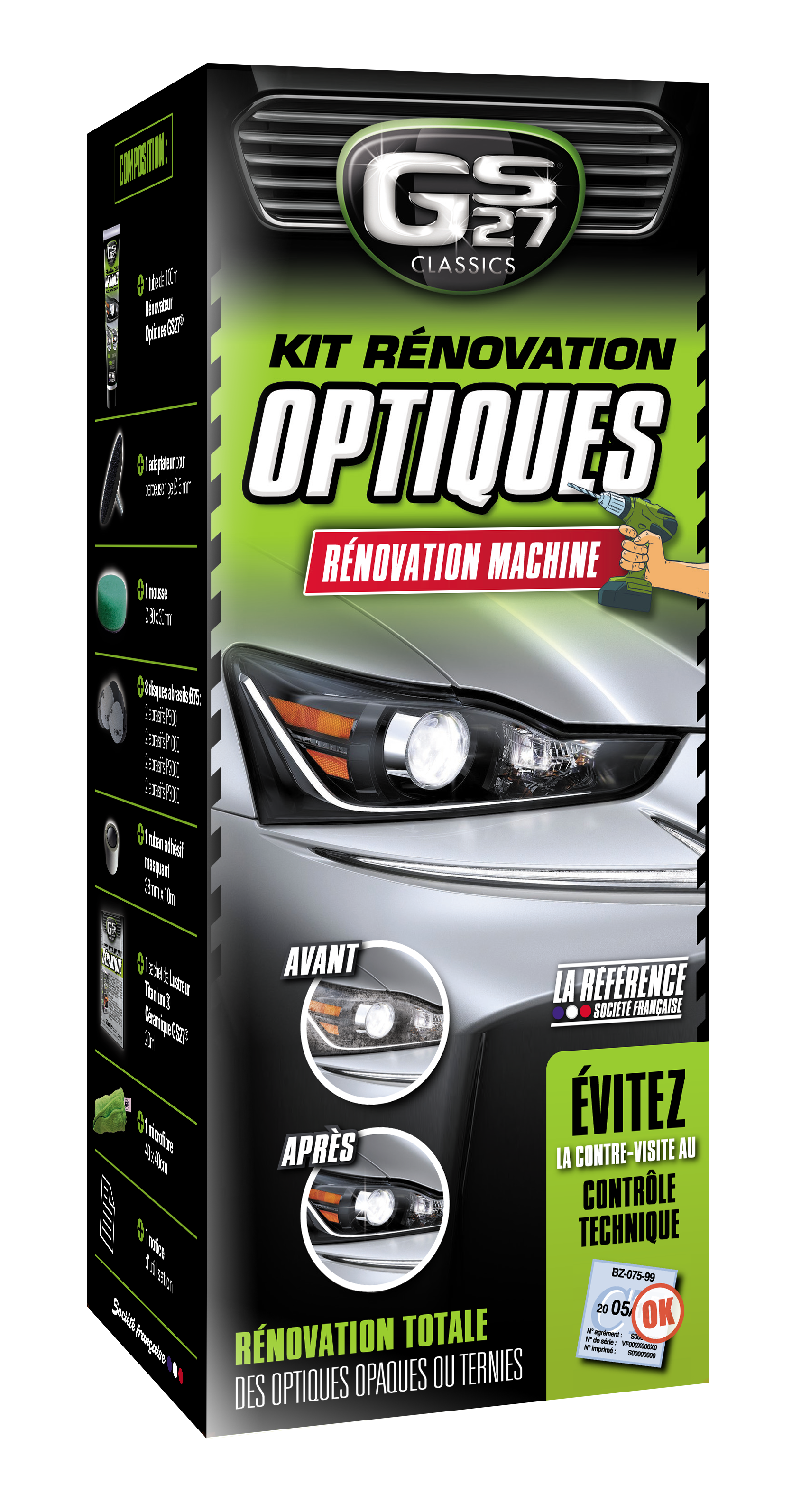 "Le Kit Rénovation Optiques GS27® Technics permet de rénover les optiques plastiques de votre véhicule ternis et jaunis par le temps. Des optiques opaques et ternis sont un motif de refus du passage au contrôle technique. Simple d’utilisation, vous avez besoin d’un kit, d’une perceuse classique et de quelques minutes devant vous. L’effet est immédiat, en quelques minutes vos optiques retrouvent leur brillance et transparence d’origine. Ce kit est très complet et il est composé de : - 1 ruban adhésif de masquage. - 1 adaptateur pour perceuse. - 6 disques abrasifs. - 1 mousse. - 1 tube rénovateur Optiques et Carrosserie. - 1 sachet de Lustreur Titanium. - 1 microfibre. Ce kit peut aussi s’appliquer sur : les rayures sur les peintures vernies, les optiques de phare plastiques, les lunettes arrière plastique de cabriolet, les jantes et enjoliveurs, les bulles de carénage de moto. "