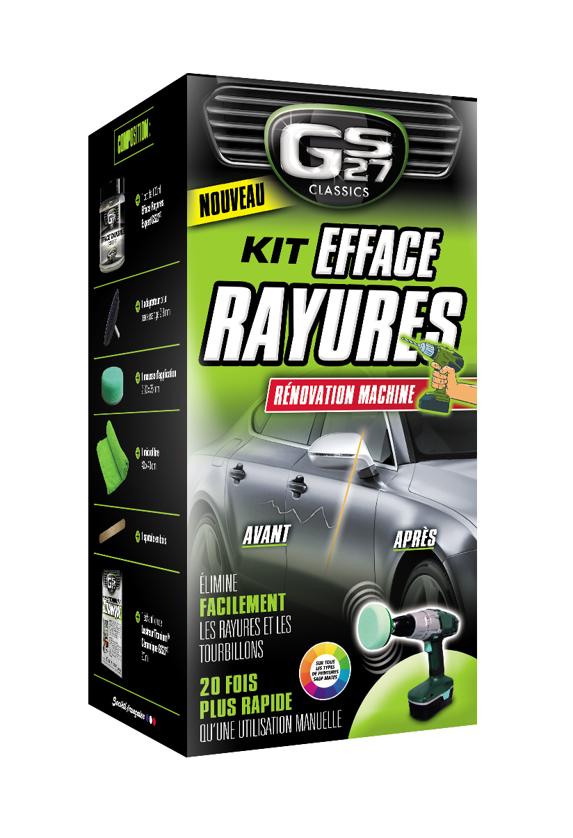Le Kit Efface-Rayures GS27 Classics permet d’éliminer facilement et rapidement toutes les rayures sur votre carrosserie. L’action mécanique de la mousse, combinée à la vitesse de rotation de votre perceuse ou visseuse, permet d’enlever les défauts 20 fois plus vite qu’à la main. En moins d’une minute, la rayure a disparu et votre carrosserie retrouve son aspect d’origine.