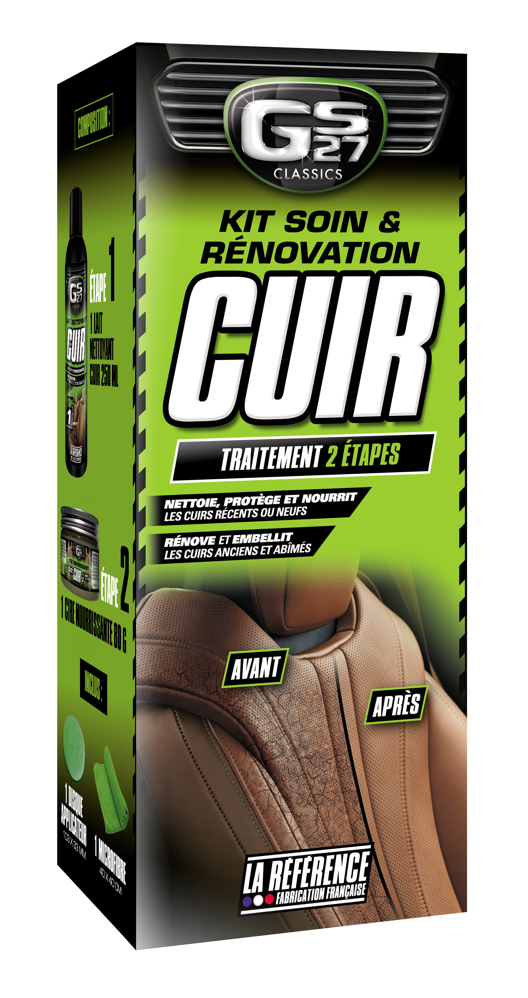 "Le Kit Soin & Rénovation Cuir GS27® est composé de tous les produits nécessaires à un soin complet de vos cuirs. Il comprend : -un lait nettoyant au pH neutre qui permet de nettoyer en profondeur des cuirs mêmes délicats sans les dessécher. -une crème nourrissante enrichie en cire de carnauba qui permet de nourrir et assouplir le cuir. Elle redonne aux cuirs leur aspect d’origine en rénovant les cuirs desséchés et craquelés. La formule du Soin & Rénovation Cuir GS27® est non grasse, elle respecte les porosités du cuir et ne laisse pas d'effet gras au toucher après utilisation. Avec ce traitement, les cuirs garderont leur souplesse et leur couleur d'origine. Les cuirs étant nourris et protégés, ils garderont un aspect neuf plus longtemps. Application : - sur tous les types de cuir sauf peaux retournées (alcantara®, daim, nubuck) et agneau plongé. - Sur tous les couleurs de cuir. Utilisation possible pour : ameublement, gants, chaussures, blousons, maroquinerie, etc."