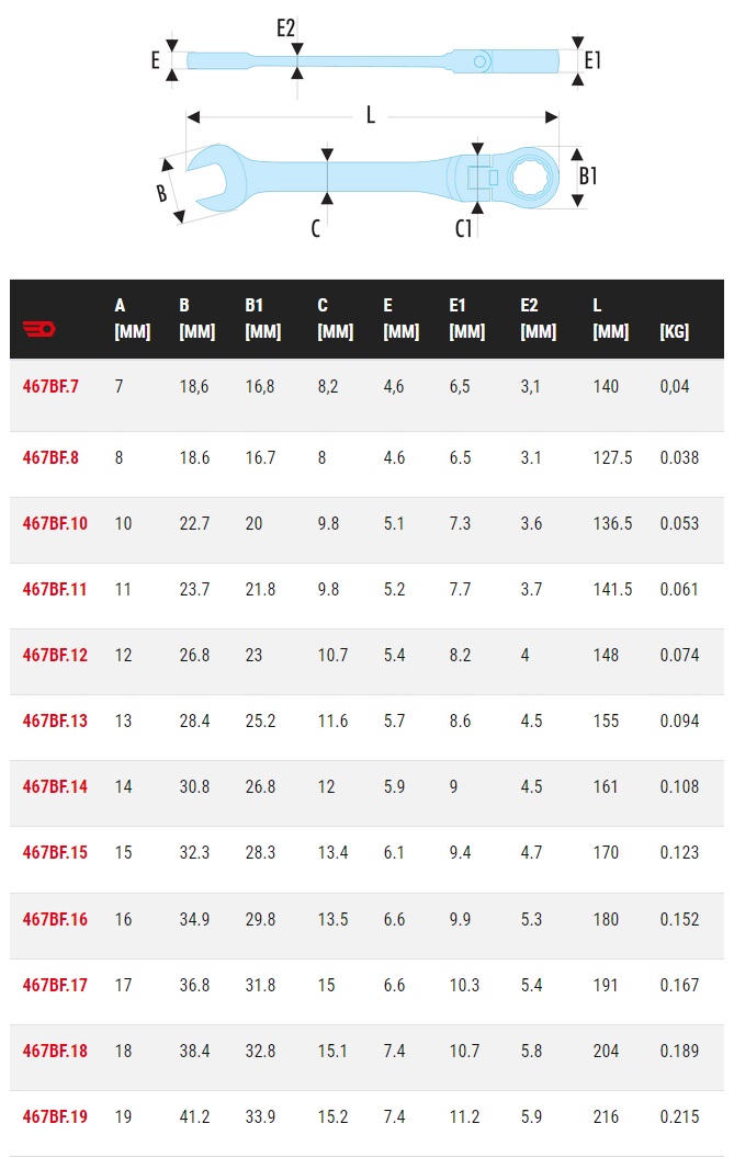 | Libellé | Clé mixte FACOM - Articulée avec cliquet - Métrique - 19 x 216mm - 467BF.19 |