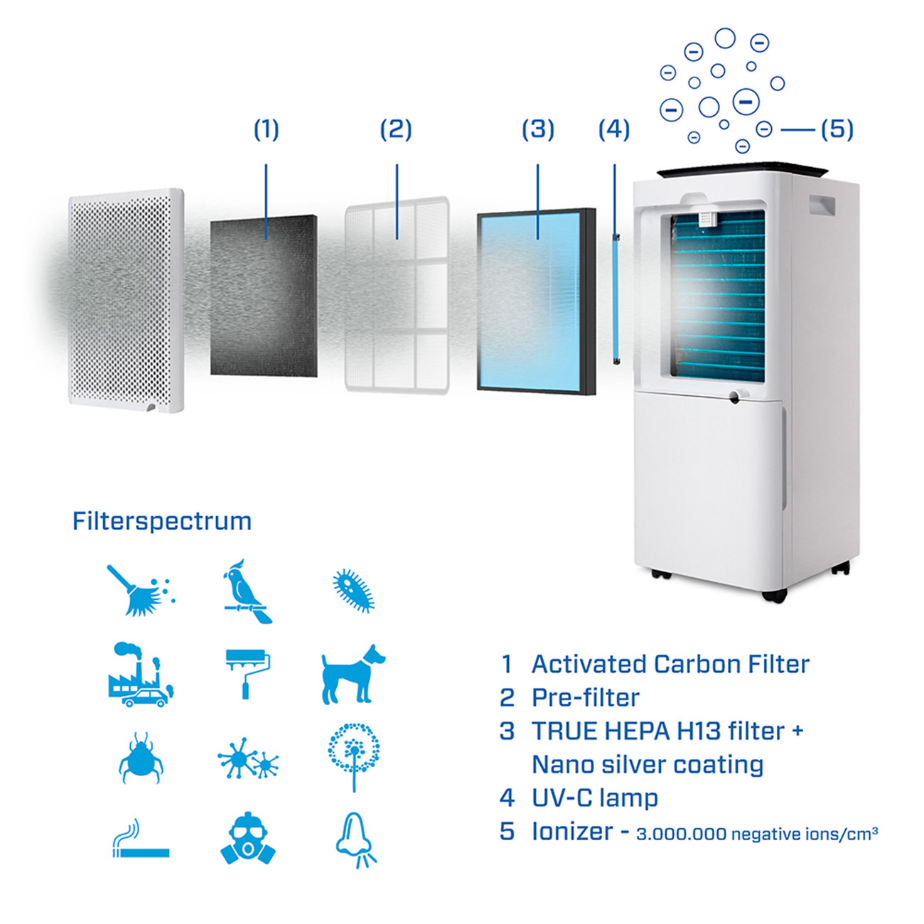 Type de filtre(s) Préfiltre, Filtre à charbon actif, Filtre TRUE HEPA H13 avec couche de nano-silver, Lampe UV-C, Ioniseur