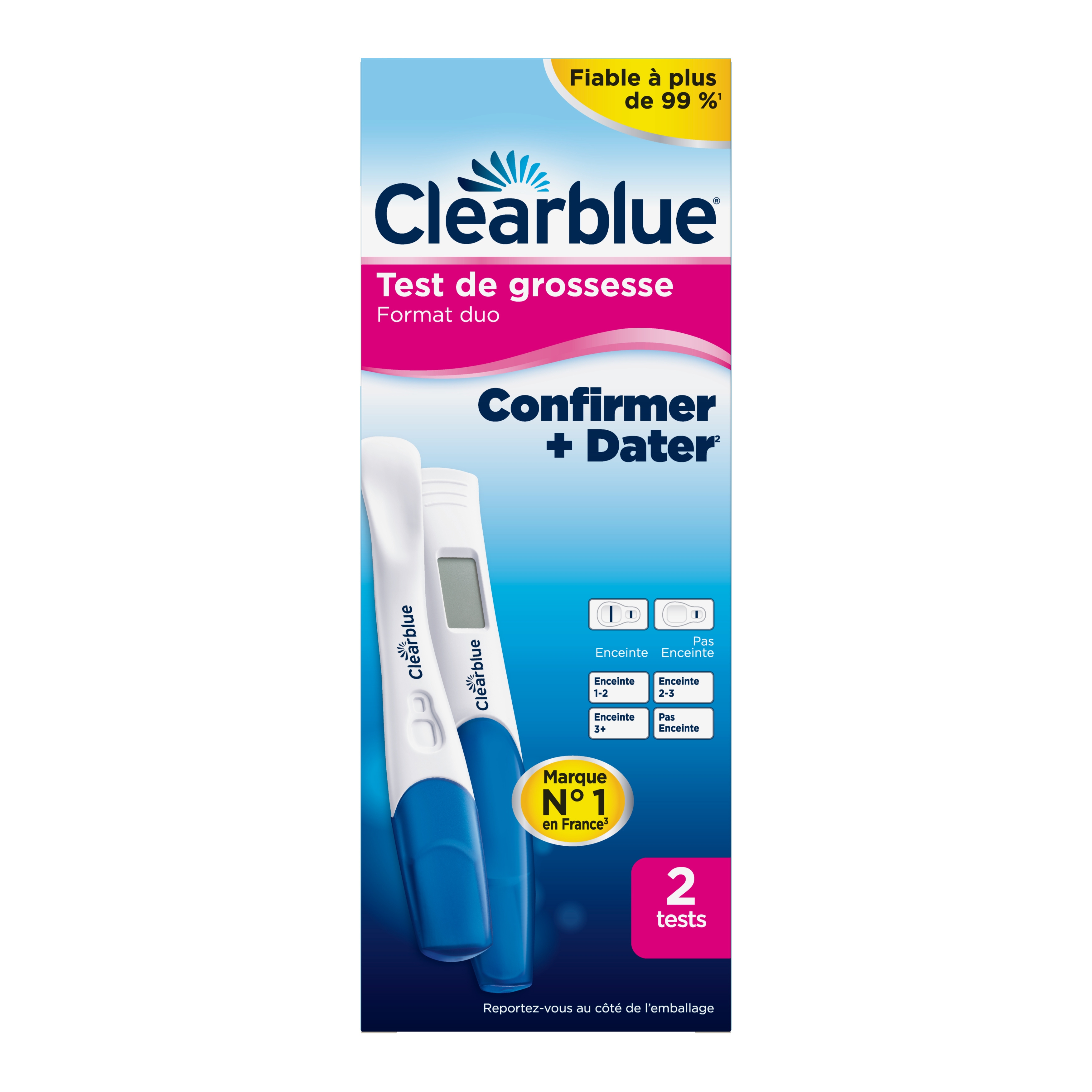 Clearblue Test de Grossesse Format Duo contient : - Clearblue Test de Grossesse Early est un test de grossesse urinaire qui permet de détecter une grossesse 6 jours avant la date de retard des règles. Fiable à 99%, il permet une détection précoce de la grossesse 6 jours avant la date présumée des règles. - Clearblue Test de Grossesse Digital possède un écran digital unique permettant de savoir si vous êtes enceinte ou non, de manière claire et lisible : "Enceinte" ou "Pas enceinte". En cas de grossesse, Clearblue Digital estime également l'âge de la grossesse, de 1 à plus de 3 semaines. Fiable à plus de 99.9%, Clearblue digital est un test facile d'utilisation, fiable et clair. Il fonctionne à partir de 4 jours avant la date présumée des règles. Lors d'une grossesse, le corps féminin crée une hormone appelée Beta HCG, qui se détecte très bien dans les urines. Le taux de BHCG augmente progressivement jour après jour en début de grossesse, ce qui permet à Clearblue Digital de détecter votre grossesse, mais également son âge, selon le taux de concentration d'hormone Beta HCG dans vos urines.