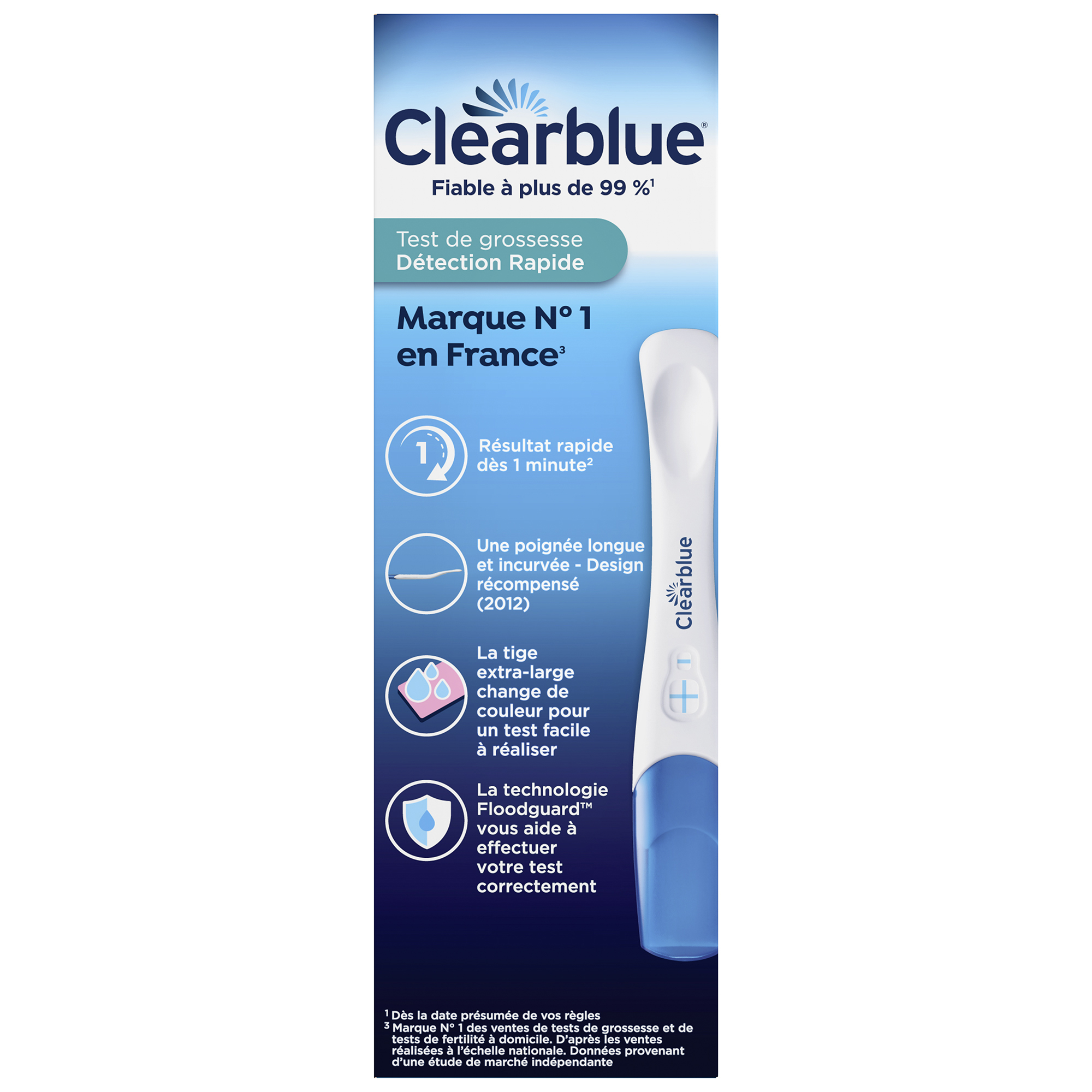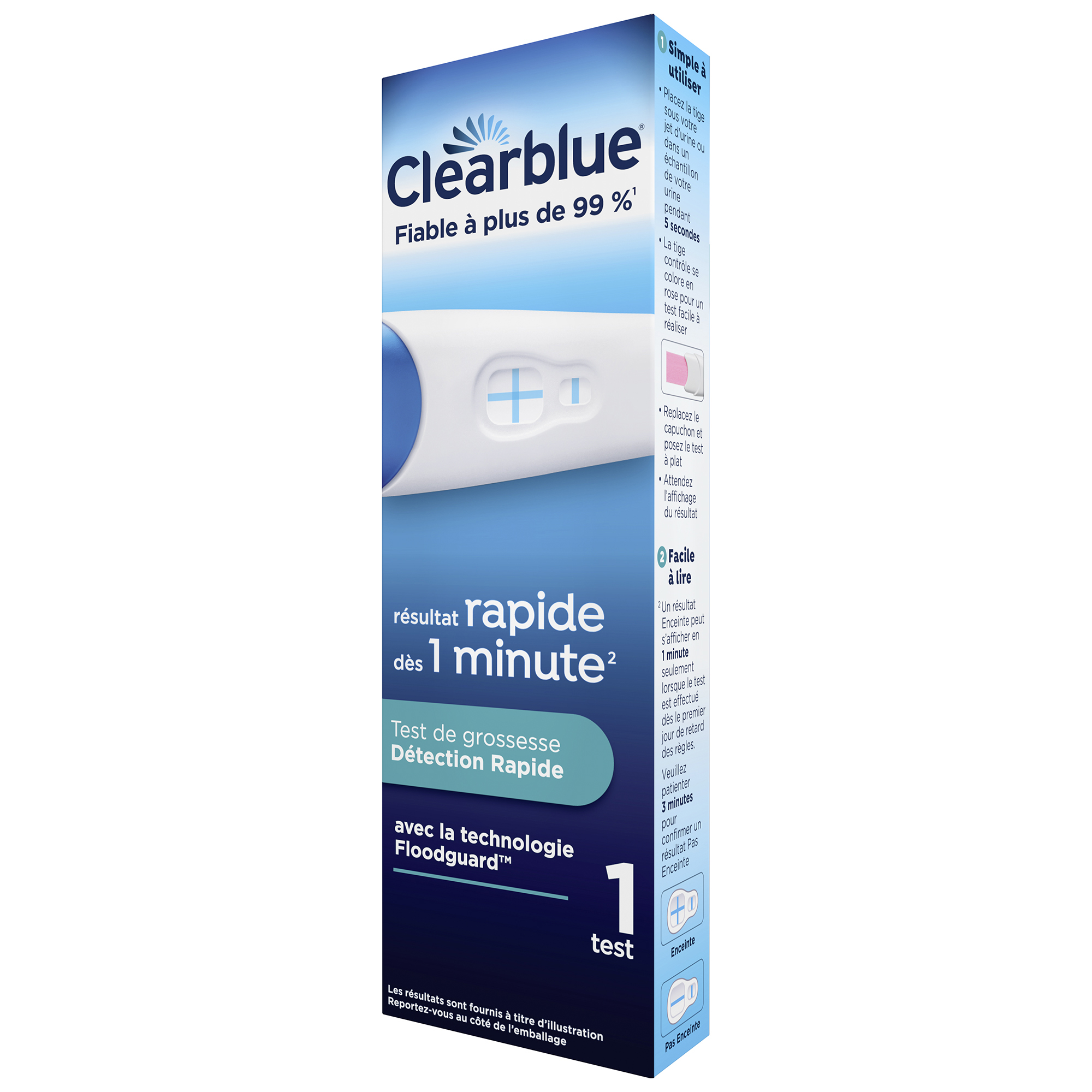 Clearblue Test de Grossesse Plus vous permet d'obtenir un résultat en 1 minute*. * Un résultat enceinte peut apparaître au cours de la minute suivant la réalisation du test lorsque celui-ci est effectué à partir du premier jour de retard des règles (qui correspond au jour suivant la date présumée de vos règles). Vous devez attendre la totalité des 3 minutes pour confirmer un résultat pas enceinte, ou lorsque vous effectuez un test avant le retard des règles. Dispositif médical à Diagnostic in vitro 98/79/EC Fabricant: SPD swiss precision Diagnostics GmbH route de st georges 47, 1213 Petit Lancy. Genève, suisse