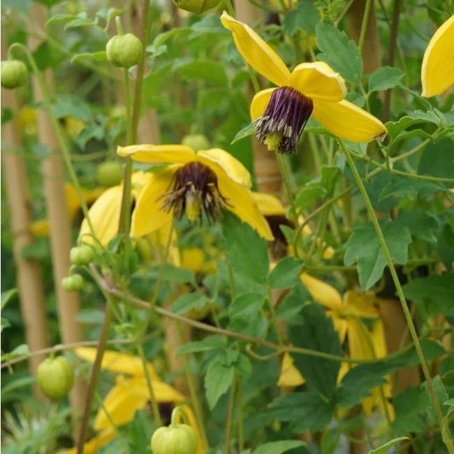 Les clematis orientalis sont réputées pour leur vigueur. Elles sont particulièrement robustes et rustiques. Elles tolèrent les expositions mi-ombragées et ne craignent pas les endroits secs. Cette vigoureuse clématite se démarque par ses fleurs jaunes simples et campanulées. Sa floraison automnale de couleur jaune d’or évoque l’été, elle crée un élégant contraste avec ses anthères bien noires.