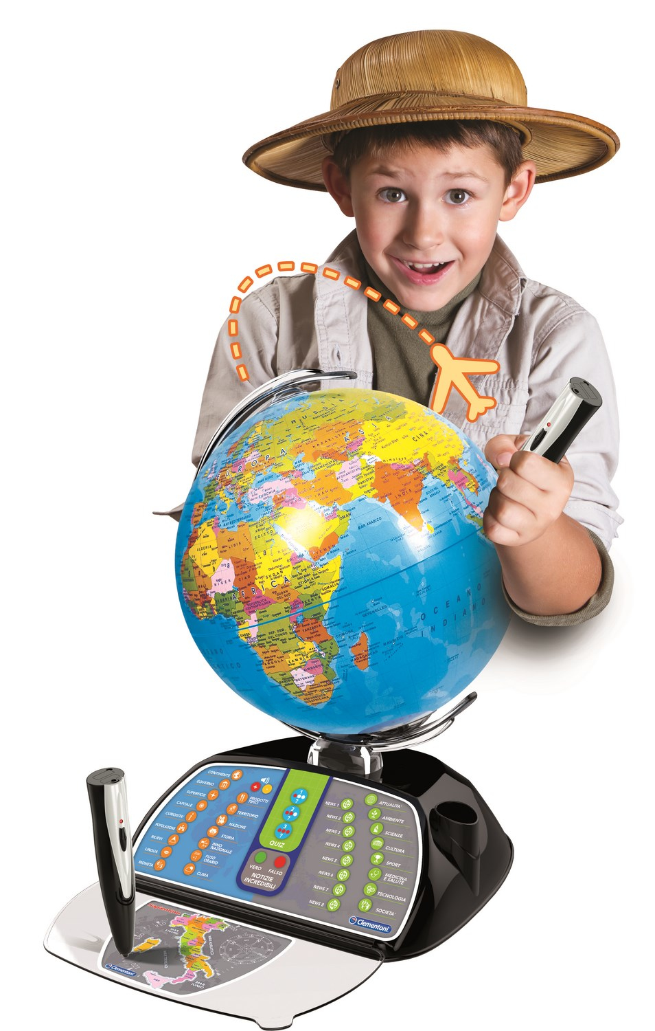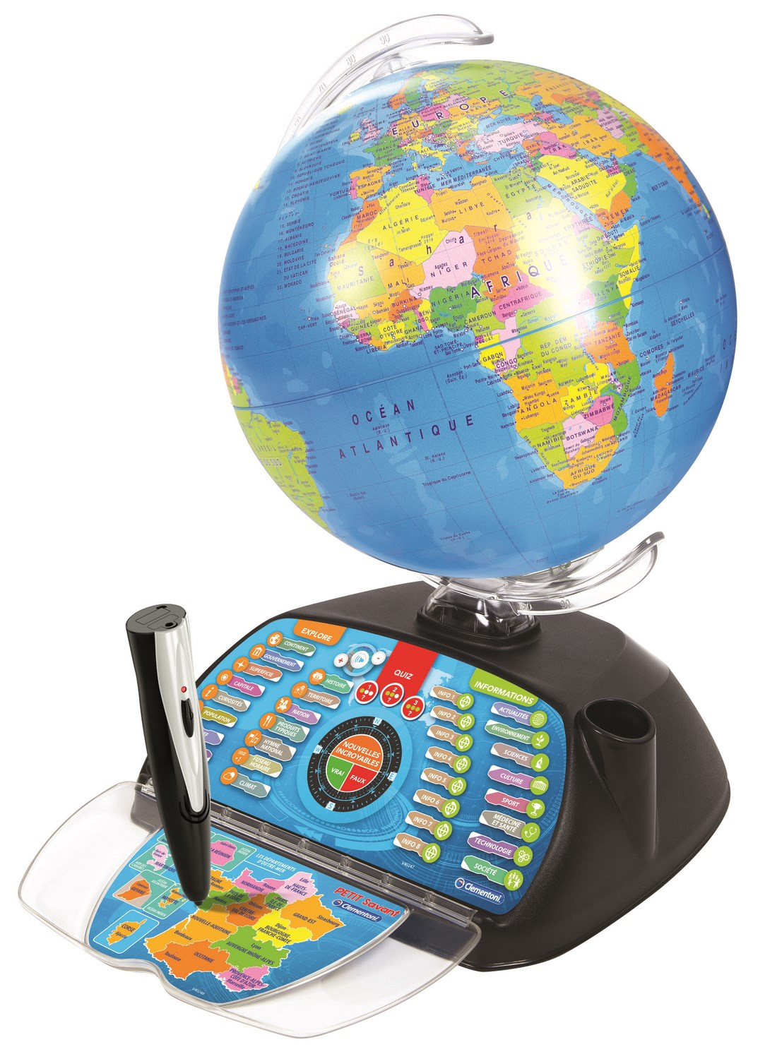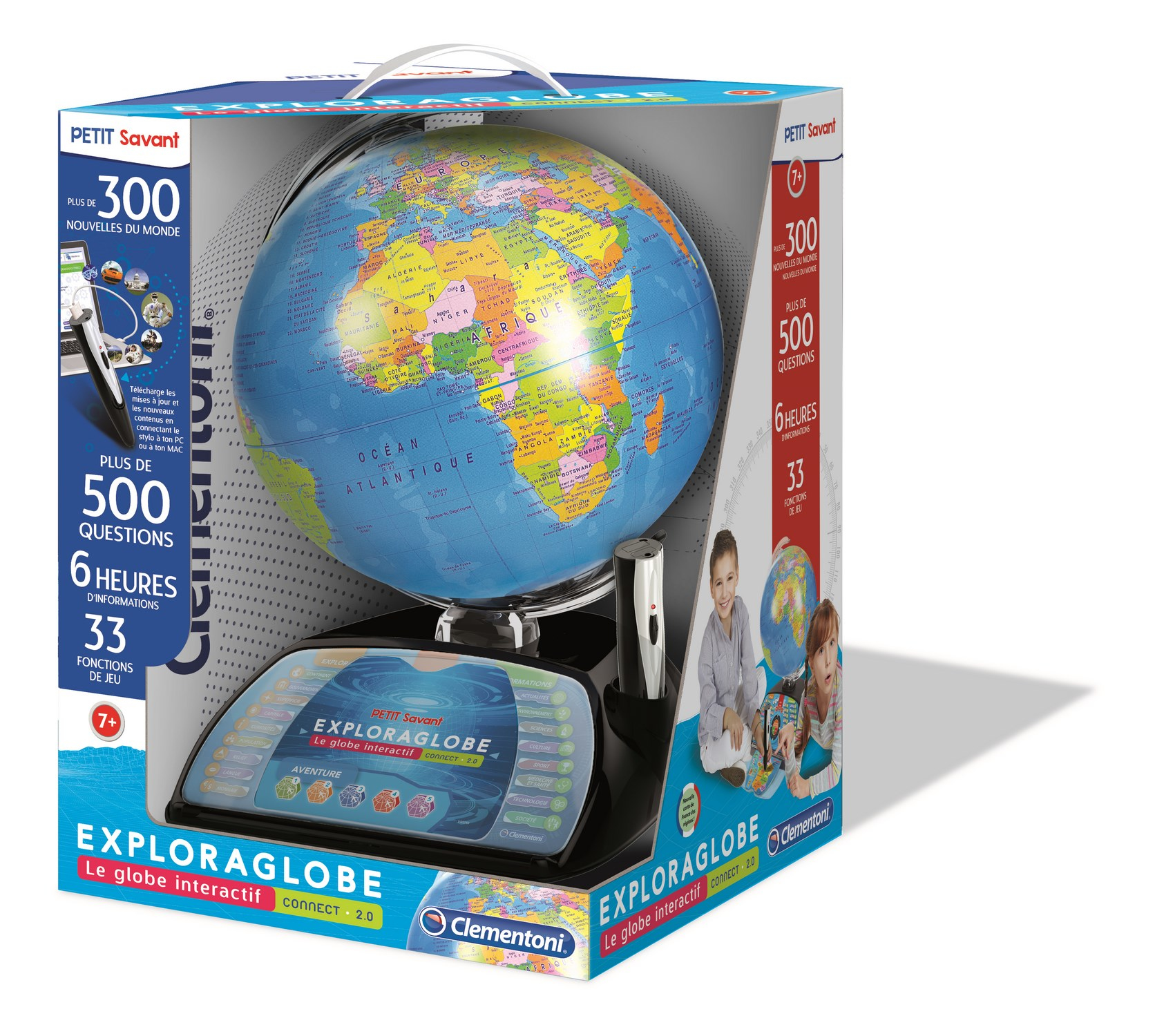 Jouez Avec Un Globe Terrestre Continuellement Mis À Jour. Connectez Le Stylo À Lecture Optique À Votre Ordinateur Et Téléchargez Les Dernières Informations Sur Le Monde Et Son Actualité. Le Globe Fait Découvrir Le Monde Et Tous Ses Pays : Capitale, Superficie, Population, Monnaie, Langue, Territoire, Géographie, Fuseau Horaire, Faits Intéressants, Produits Typiques, Hymne National, Climat, Histoire, Gouvernement Et Chef D'État, Science Et Technologie, Actualité, Événements Sportifs. Grâce À L'Application En Réalité Augmentée Pour Tablette Et Smartphone, Le Globe Prend Vie : L'Enfant Pourra Visualiser Des Animaux, Des Monuments, Des Cultures Différentes Et Beaucoup De Faits Intéressants. Plus De 500 Questions Réparties En 3 Niveaux De Difficulté.