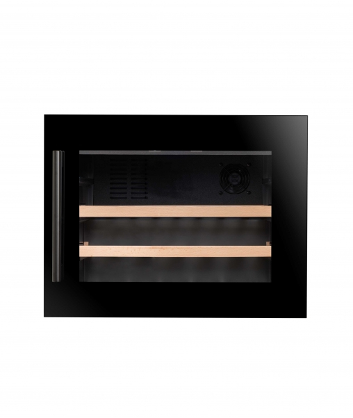 La porte est un double vitrage transparent en verre trempé. Elle laisse entrevoir les 2 clayettes semi-coulissantes en bois naturel qui, associées au noir, offrent un esthétique soigné et attrayant.