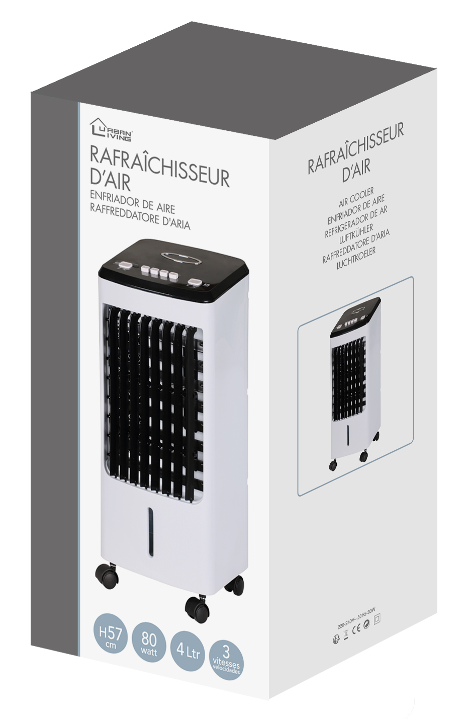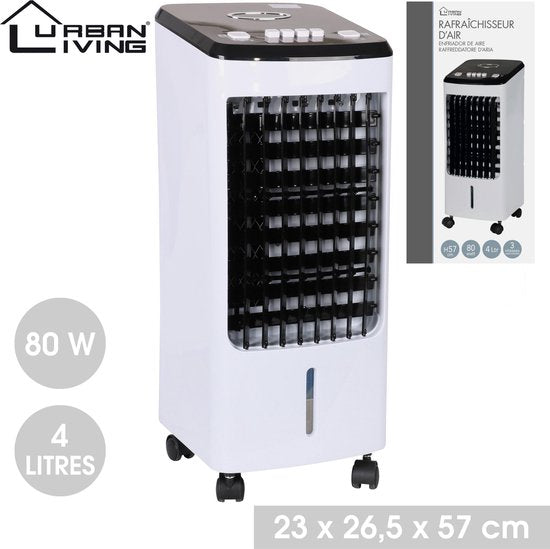 Profitez d'un climat intérieur optimal avec le rafraîchisseur d'air mobile 80W de URBAN LIVING. Ce climatiseur 4 en 1 offre les fonctions de ventilateur, rafraîchisseur d'air, humidificateur d'air et système d'ionisation pour réduire les particules de poussière et neutraliser les odeurs désagréables. Avec une consommation basse de 80W et un réservoir d'eau amovible de 4 litres, cet appareil est facile à installer et à utiliser immédiatement. Les lamelles et la fonction oscillation de 45° permettent une distribution optimale de l'air froid, tandis que les 4 roulettes pivotantes à 360° et la poignée rendent le climatiseur très mobile. Les avantages du produit incluent 3 niveaux de puissance, une ionisation, 4 blocs réfrigérants inclus et une installation rapide. Les dimensions de l'appareil sont de 23 x 26,5 x 57 cm et il pèse 4,4 kg. Référence fabricant: EFN28970. Disponibilité des pièces détachées: Non communiquée. Couleurs disponibles: blanc / noir.