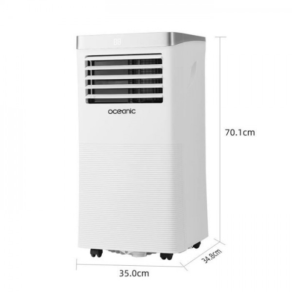 Le climatiseur mobile monobloc Oceanic est un appareil multifonctionnel qui peut etre utilisé comme climatiseur, déshumidificateur et ventilateur. Il a une capacité de refroidissement de 2930 Watts (10000 BTU) et un panneau de commandes avec affichage LED et commandes tactiles. Avec sa fonction de déshumidification, il permet d'extraire jusqu'a 40 L/jour d'humidité.