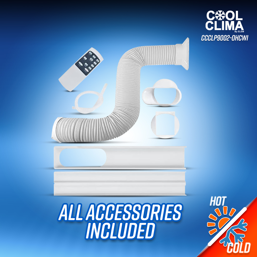 - Accessoires fournis: 1 tuyau d'évacuation ( diamètre 15cm) avec raccord de fixation, un kit fenêtre coulissante, une télécommande (fonctionne avec 2 piles AAA non fournies), 1 manuel d'utilisation