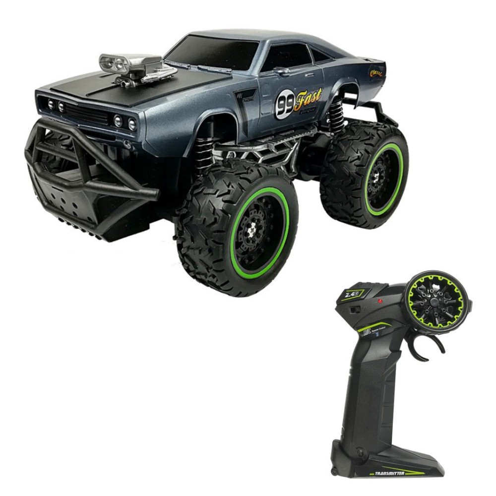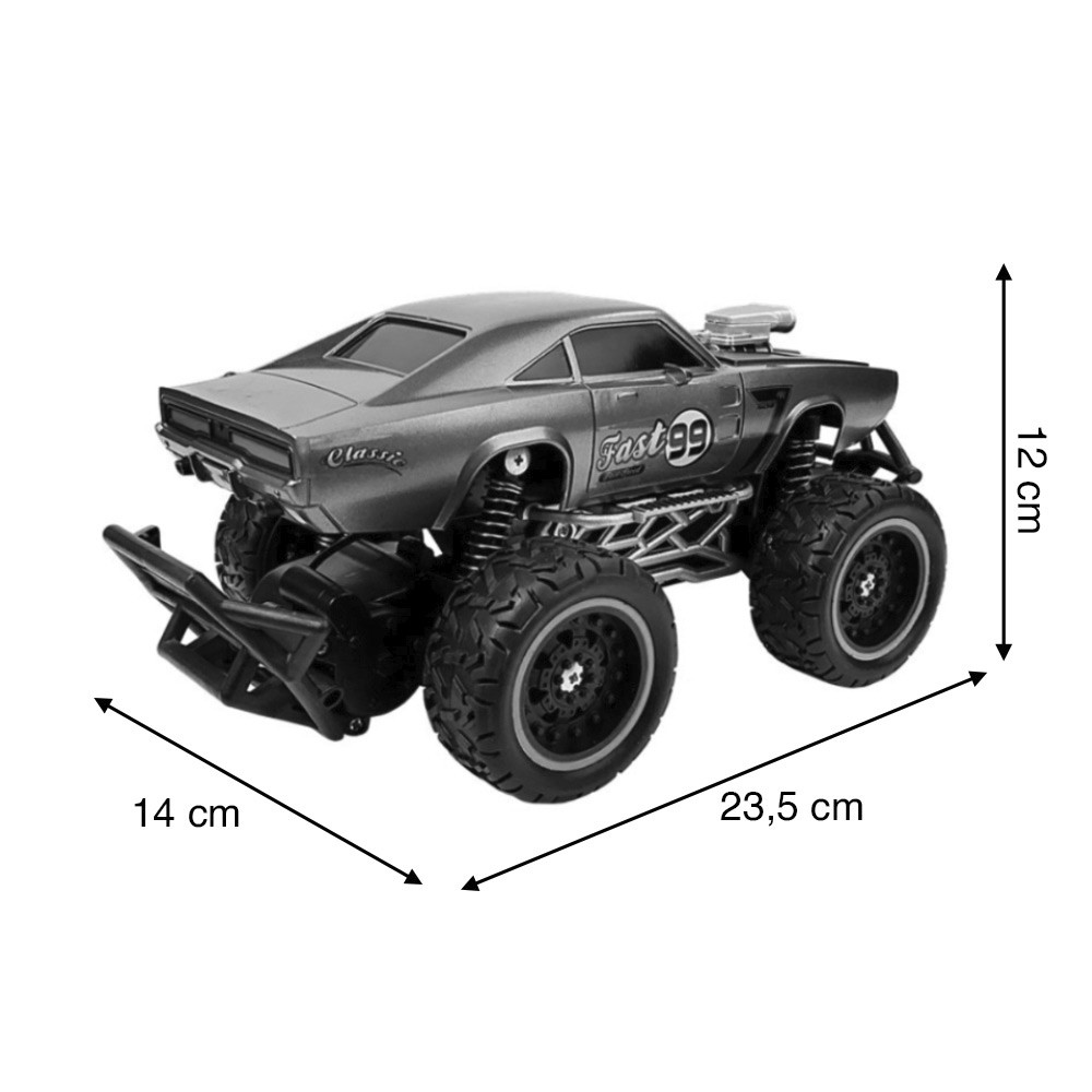 Les grosses roues en caoutchouc et les amortisseurs de cette voiture télécommandée en font une voiture tout terrain. Elle se déplace à une vitesse maximale de 6,5 km/h. La télécommande est sans fil.