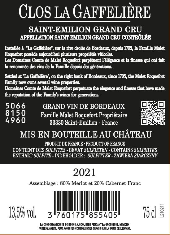 | Libellé | Clos La Gaffeliere, 2021 - Saint-Emilion Grand Cru AOP - Rouge - 75 cl |