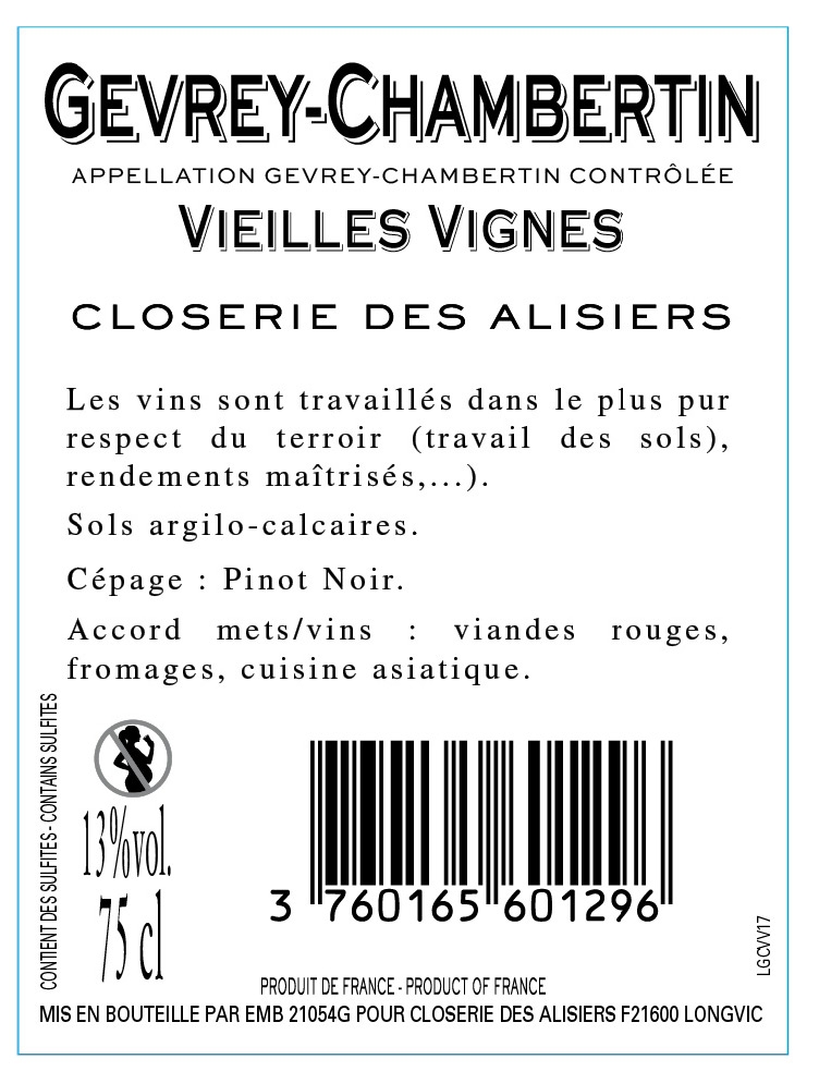 | Libellé | Closerie des Alisiers - Vieilles Vignes, 2019 - Gevrey-Chambertin AOP - Rouge - 75 cl |