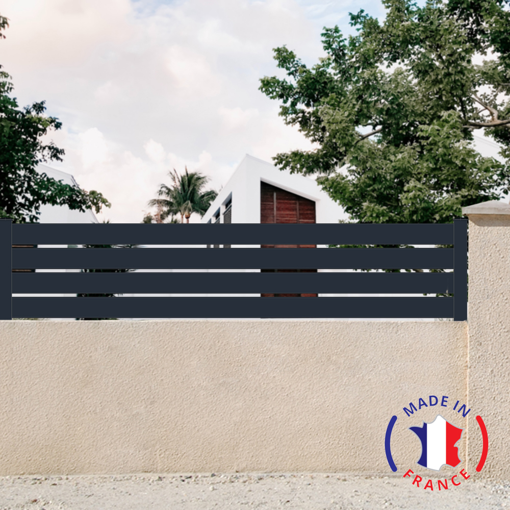 | Libellé | Clôture aluminium 4 lames modèle ajouré en kit s L.2107mm (poteaux compris) X H.455mm couleurs Gris RAL 7016 |