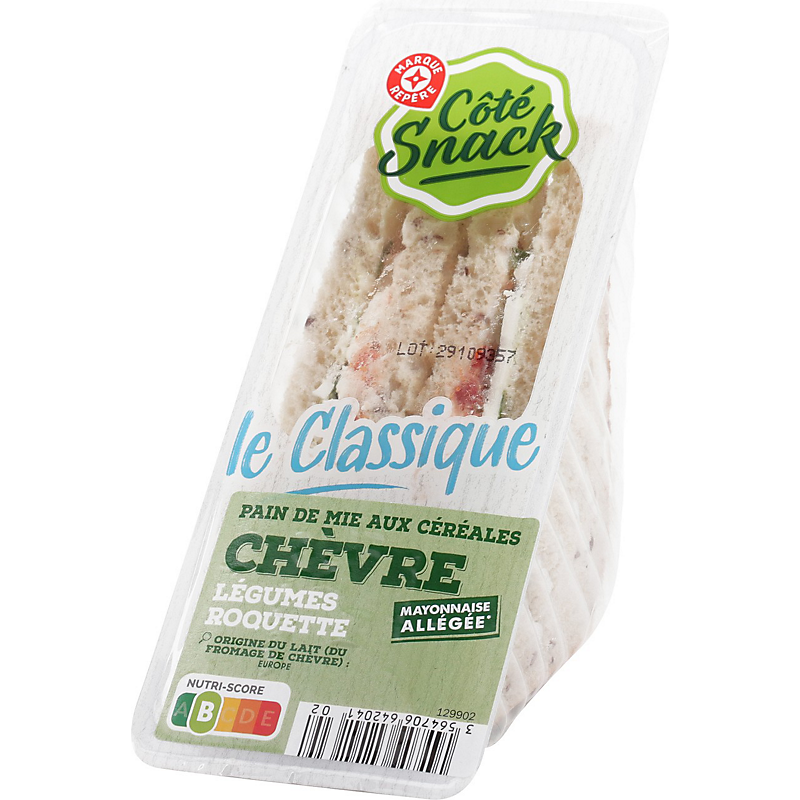 Ingrédients : Pain de mie aux céréales 48 % (farine de blé 23,2 %, eau, graines de tournesol 1,8 %, graines de lin brun 1,6 %, semoule de blé dur, huile de colza, sucre, farine de seigle 0,9 %, flocons d’orge 0,5 %, farine d’orge 0,2 %, farine de sarrasin 0,2 %, farine d’avoine entière 0,2 %, farine de riz 0,2 %, levure, sel, gluten de blé, levain de seigle déshydraté et dévitalisé) ; fromage de chèvre 15 % ; mayonnaise allégée en matières grasses* 10,1 % (eau, huile de colza, moutarde de Dijon (eau ; graines de moutarde ; vinaigre d'alcool ; sel), vinaigre d'alcool, amidon de maïs, jaune d’œuf, sucre, sel, jus de citron concentré) ; tomate 10 % ; yaourt maigre ; courgette 4 % ; roquette ; tomate semi-déshydratée 2 % ; fibre de blé.