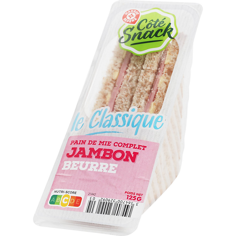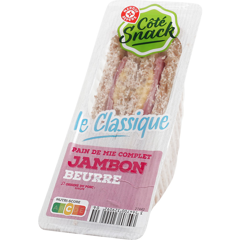 Sandwich au pain de mie complet garni de jambon cuit standard, aromatisé, et de beurre COTE SNACK
