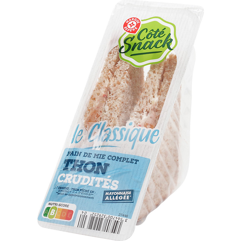 Ingrédients: Pain de mie complet 48 % (farine complète de blé 29 %, eau, huile de colza, gluten de blé, sucre, sel, dextrose, levure, farine de blé, émulsifiant : E471, agent de traitement de la farine : acide ascorbique) ; thon au naturel 20 % (thon Listao, eau, sel) ; tomate 13 % ; mayonnaise allégée en matières grasses* 13 % (eau, huile de colza 4,1%, vinaigre d'alcool, jaune d'œuf, amidon modifié de maïs et/ou de pomme de terre, sucre, moutarde de Dijon (eau ; graines de moutarde ; vinaigre d'alcool ; sel), sel, lait écrémé reconstitué, acidifiant : acide citrique, épaississant : gomme xanthane) ; salade 3,4 %