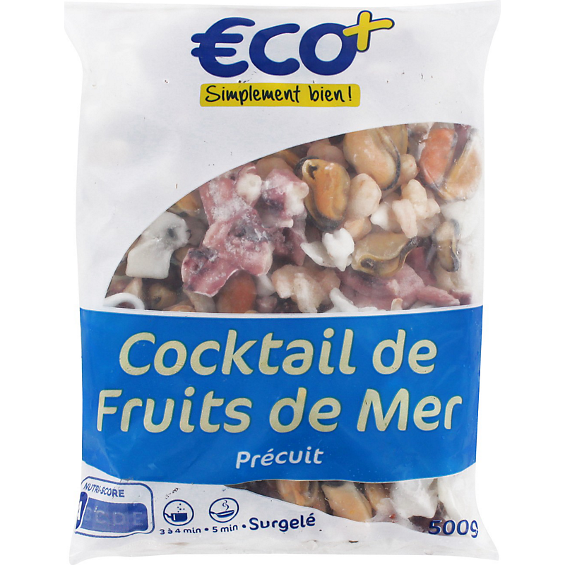 Mélange surgelé de fruits de mer composé de : - Moules du Pacifique décoquillées cuites Mytilus chilensis, élevées au Chili - Tronçons d'encornet géant cuits Dosidicus gigas, pêché aux chaluts ou aux lignes et hameçons en Océan Pacifique Sud-Est (A) ou têtes et pattes d’encornet blanchies Loligo duvauceli, pêché aux chaluts en Océan Indien Est et/ou Ouest (B) ou Loligo chinensis ou Loligo edulis, pêché aux chaluts en Océan Pacifique Centre-Ouest et/ou Pacifique Nord-Ouest (C) - Lamelles d'encornet blanchies Loligo duvauceli pêché aux chaluts en Océan Indien Est et/ou Ouest (D), ou Loligo chinensis ou Loligo edulis, pêché aux chaluts en Océan Pacifique Centre-Ouest et/ou Nord-Ouest (E) - Crevettes décortiquées blanchies Solenocera crassicornis ou Parapenaeopsis stylifera, pêchées aux chaluts en Océan Indien Est et/ou Ouest. Pour connaître l'origine et l'espèce des encornets, regarder la lettre sous le numéro de lot. ECO +