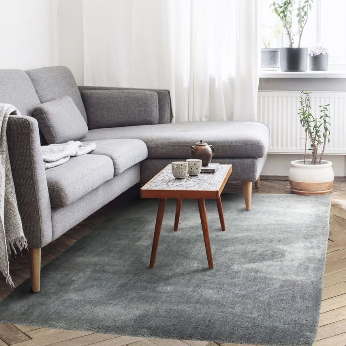 Un grand tapis au coloris gris tendance, à la fibre fine, extra douce et lumineuse qui embellira votre salon ou votre chambre.