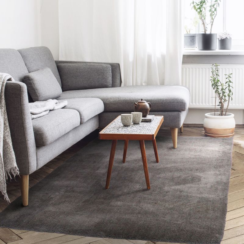 Un grand tapis au coloris taupe tendance, à la fibre fine, extra douce et lumineuse qui embellira votre salon ou votre chambre.