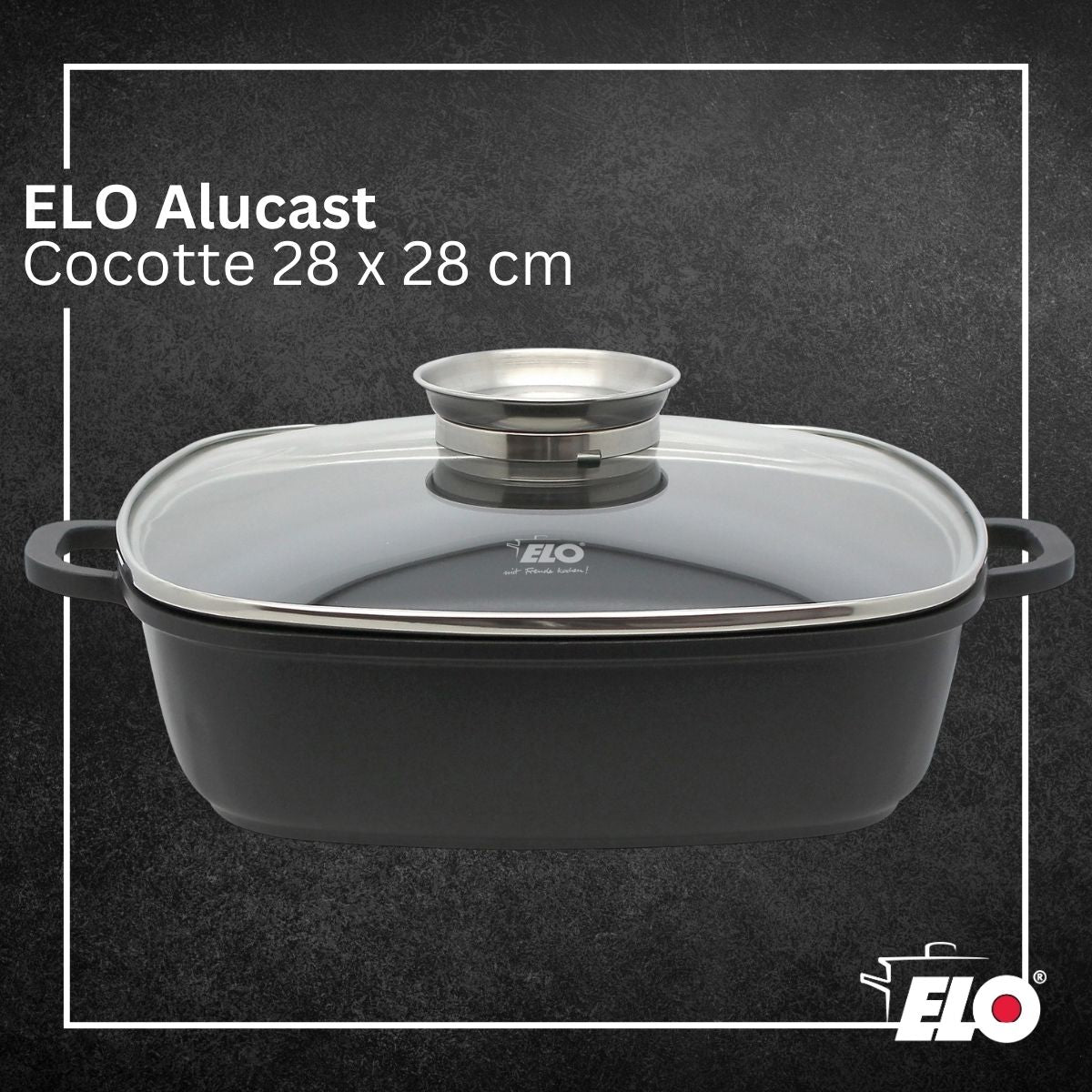 DESCRIPTION: Cocotte Elo Alucast carrée 28 cm ; 3,6 litres pour 5 personnes, en fonte d'aluminium moulée légère, avec revêtement antiadhésif ELODUR® Select PETIT +: Optimale pour une utilisation avec peu de matière grasse ; couvercle en verre résistant aux chocs, avec bouton aromatique pour un ajouter des liquides facilement, et sans perdre de chaleur COMPOSITION: Fonte d'aluminium moulée noire, avec poignées intégrées, revêtement antiadhésif ELODUR® Select ; couvercle en verre, cerclé d'acier inoxydable protégeant des chocs DIMENSIONS: Cocotte évasée L x l 28 x 28 cm à l’intérieur, Epaisseur paroi 2 mm, Hauteur 8 cm, Hauteur avec couvercle 12,8 cm, Zone cuisson 18 cm, Anses 4 cm, 3,6 L circa UTILISATION: Compatible tous feux dont induction, et four jusqu'à 180° avec couvercle, et 240 °C sans couvercle ; pour rôtir, mijoter, caraméliser, garder au chaud, cuire au four ENTRETIEN: Laver à la main avec une éponge douce pour préserver le revêtement ; ne rien couper à l'intérieur La cocotte Alucast ovale est un ustensile de cuisine haut de gamme qui allie performance et esthétisme. La fonte d'aluminium moulée légère garantit une répartition uniforme de la chaleur, tandis que son revêtement antiadhésif ELODUR® Select permet une cuisson avec peu de matière grasse et un nettoyage aisé. Le couvercle en verre, doté d'un bouton aromatique, facilite l'ajout d'ingrédients liquides pendant la cuisson. Inutile de l'ouvrir pour surveiller la cuisson, ce qui est synonyme d'économie d'énergie. Sa compatibilité avec tous les types de cuisinières, y compris l'induction, et sa capacité à résister à des températures allant jusqu'à 240 °C en font un choix privilégié pour votre cuisine. Les poignées en fonte d'aluminium robustes assurent une prise en main sécurisée. Garantie 4 ans.