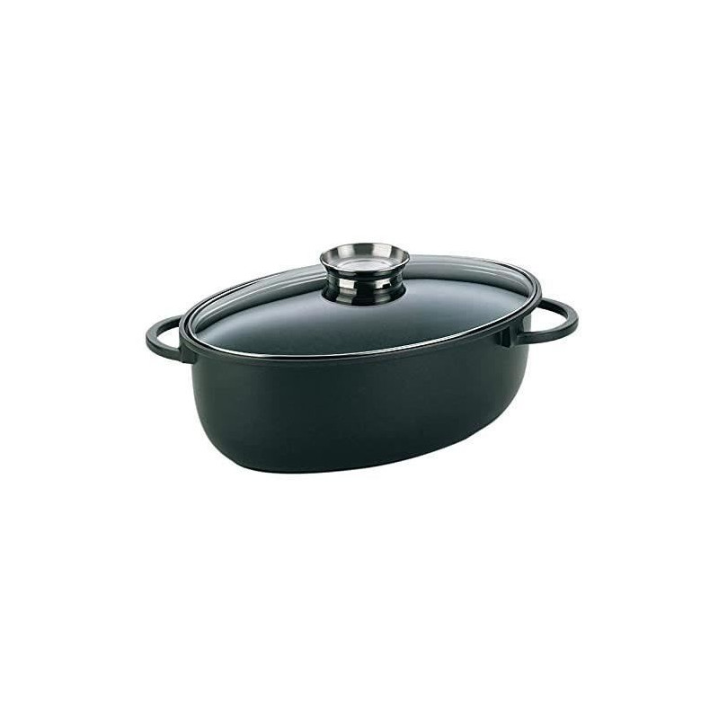 15153 - cocotte à braiser en fonte d?aluminium 45cm noir - Cocotte à braiser KELA 15153 Kerros. La perfection pour une cuisine plaisir au quotidien ! Avec couvercle en verre avec bouton arôme.Lorsque le bouton arôme est rempli d'eau. de bouillon ou de vin. le lent égouttement permet de relever le goût de vos préparations.Son volume de 8 L permet de l'utiliser de manière optimale dans le four.En fonte d?aluminium de 5 mm d'épaisseur avec revêtement anti-adhésif Greblon C3+ (revêtement tripe épaisseur renforcé par des particules de céramique) pour une cuisson sans graisse.Résiste à 220 C°.Passe au four : pour terminer une cuisson ou pour maintenir au chaud.Poignées décalées pour une bonne prise en main et pour un gain de place dans le four ou les placards.Entretien facile : passe au lave-vaisselle. - Matière : fonte d?aluminium de 5mm.