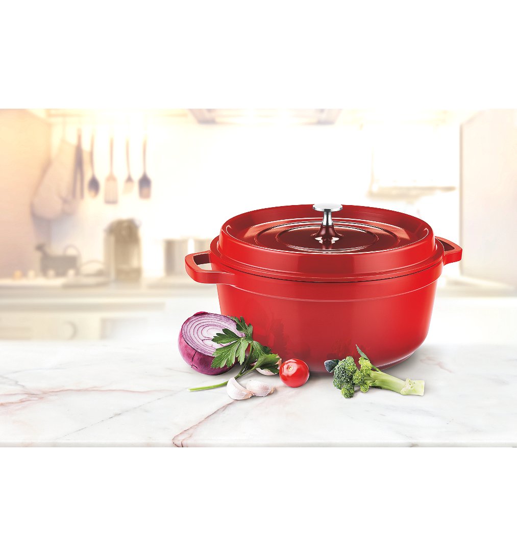 Cocotte ronde en fonte d'aluminium - ø 28cm - tous feux dont induction - répartition uniforme de la chaleur - revêtement intérieur anti-adhésif - couleur extérieure rouge - manipulation facile et agréable - durable et facile à entretenir