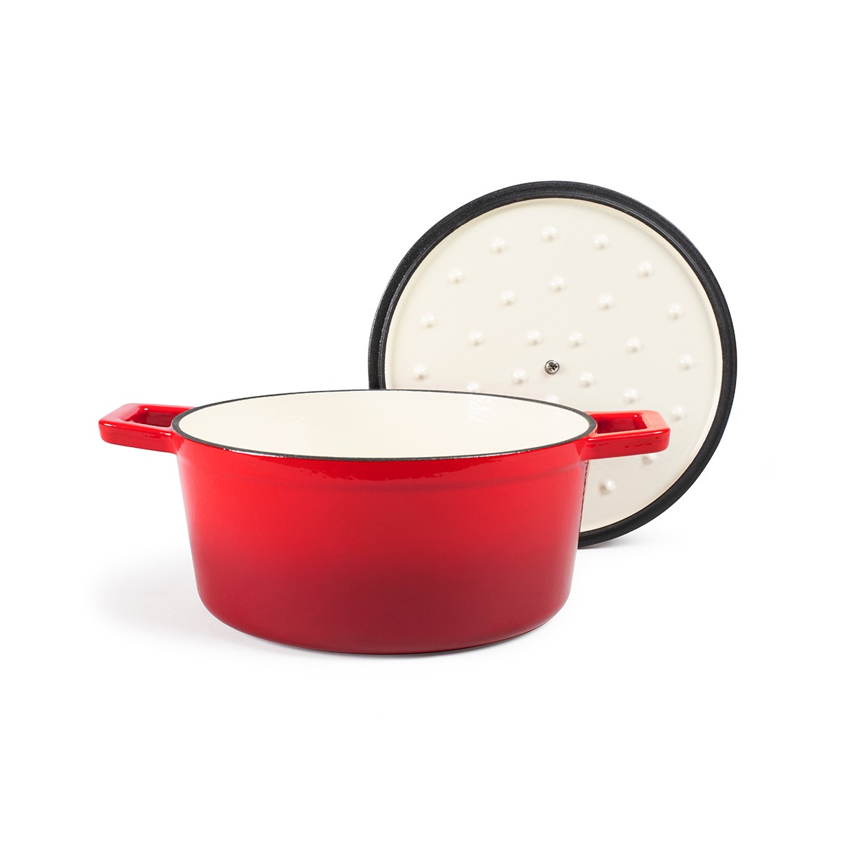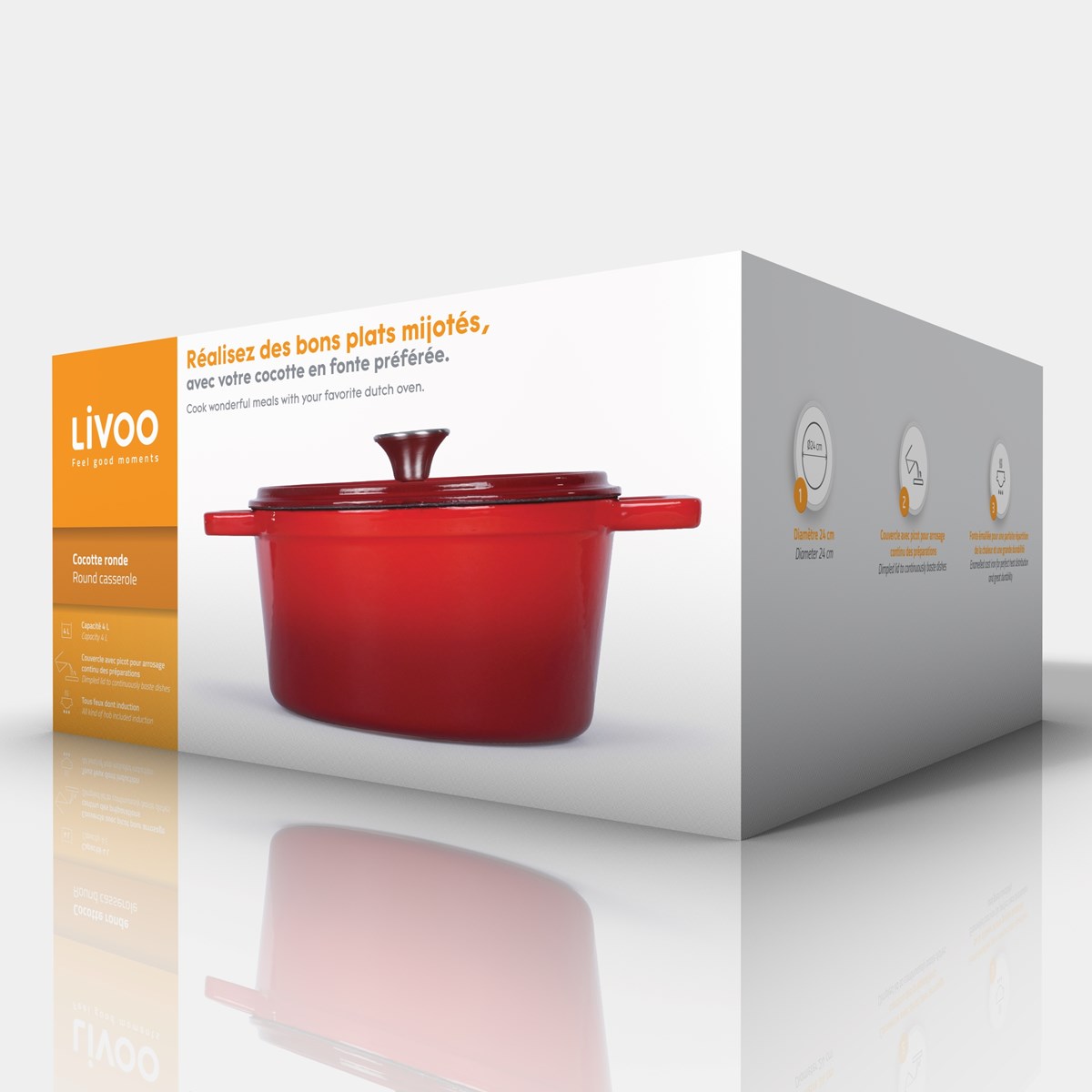 Fonte émaillée. Ø 24 cm. Capacité 4 L. Couvercle avec picot pour arrosage continu des préparations. Compatible tous feux dont induction. Dimensions avec couvercle + poignées (L x l x H) 31,7 x 24 x 14 cm; Poids 4,5 kg