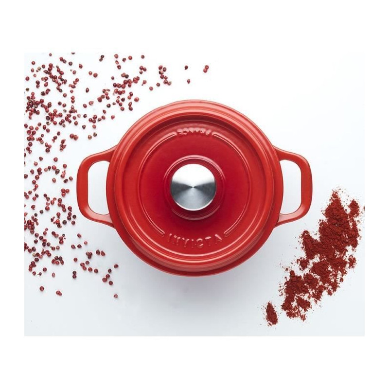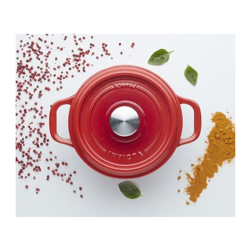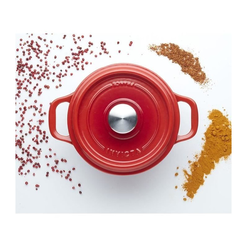 402200 - cocotte ronde en fonte émaillée 20cm rubis - Cocotte en fonte émaillée Invicta 402200 est idéale pour mijoter tous vos plats en sécurité grâce à son astucieux couvercle à réserve d'eau et à picots intérieurs qui permet d'hydrater vos préparations en permanence et sans surveillance en assurant un arrosage homogène et continu tout en conservant les saveurs.- La fonte reste le meilleur matériau pour cuisiner en toute simplicité car elle diffuse uniformément la chaleur et la conserve longtemps- Le goût et les arômes restent intenses et les couleurs naturelles des aliments sont préservées- En fonte émaillée extérieur : 3 couches d'émail qui garantissent un nettoyage facile.- Anses larges pour faciliter la prise en main.- Bouton du couvercle en inox pour résister au fortes températures du four. - Type : Cocotte.