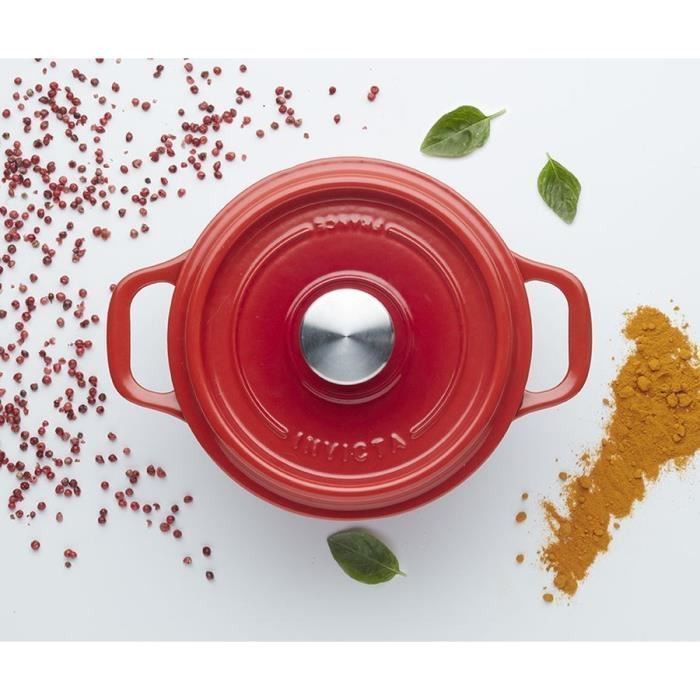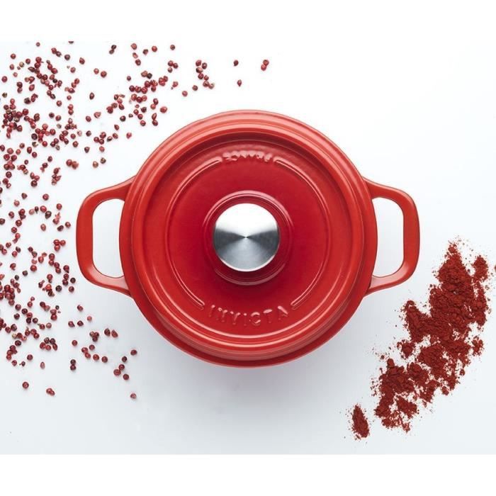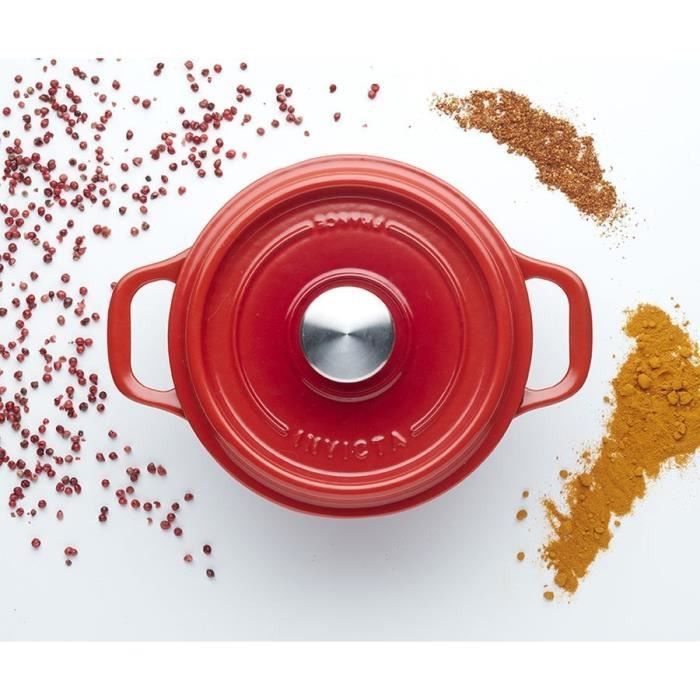 402240 - cocotte ronde en fonte émaillée 24cm rubis - Cette cocotte ronde INVICTA 402240 est idéale pour mijoter tous vos plats en sécurité grâce à son astucieux couvercle à réserve d'eau et à picots intérieurs qui permet d'hydrater vos préparations en permanence et sans surveillance en assurant un arrosage homogène et continu tout en conservant les saveurs.La fonte reste le meilleur matériau pour cuisiner en toute simplicité car elle diffuse uniformément la chaleur et la conserve longtemps.Le goût et les arômes restent intenses et les couleurs naturelles des aliments sont préservées.En fonte émaillée extérieur : 3 couches d'émail qui garantissent un nettoyage facile. - Couleur : Rubis.