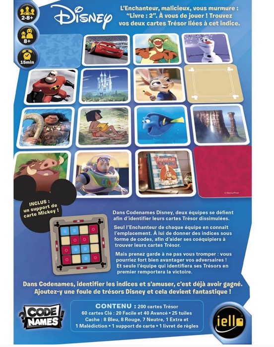 à partir de 8 ans moins de 30 min 2 à 8 joueur(s) Dans Codenames Disney, deux équipes se défient afin d'identifier leurs cartes Trésor dissimulées.Seul l'Enchanteur de chaque équipe en connaît l'emplacement. À lui de donner des indices sous forme de codes, afin d'aider ses coéquipiers à trouver leurs cartes Trésor.Mais prenez garde à ne pas vous tromper : vous pourriez fort bien avantager vos adversaires ! Et seule l'équipe qui identifiera ses Trésors en premier remportera la victoire.Dans Codenames Disney, identifier les indices et s'amuser, c'est déjà avoir gagné. Ajoutez-y une foule de trésors Disney et cela devient fantastique !