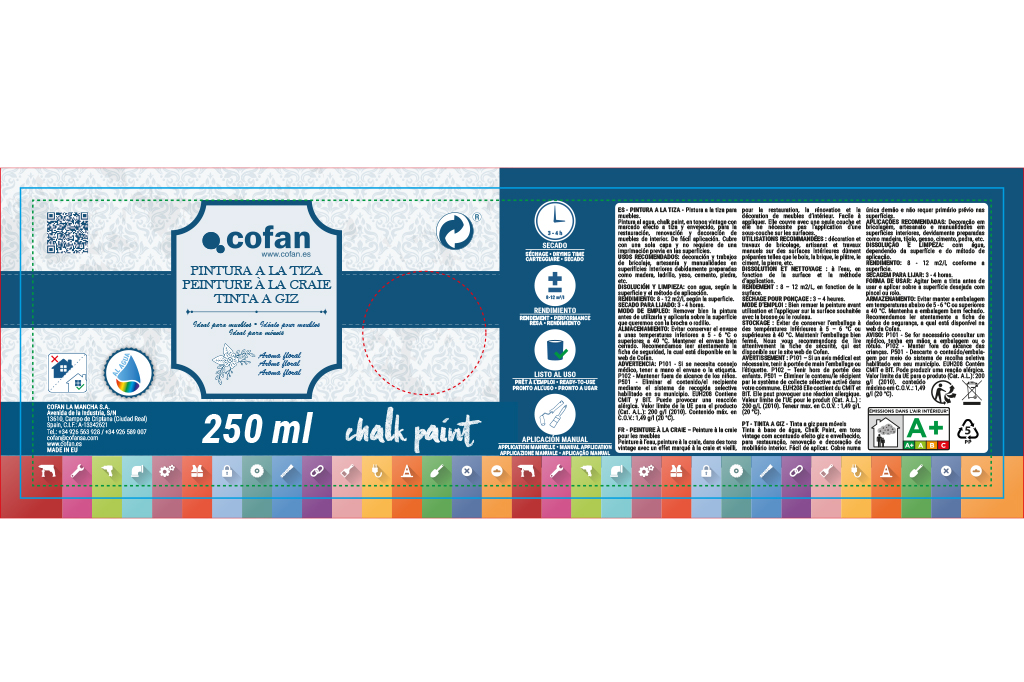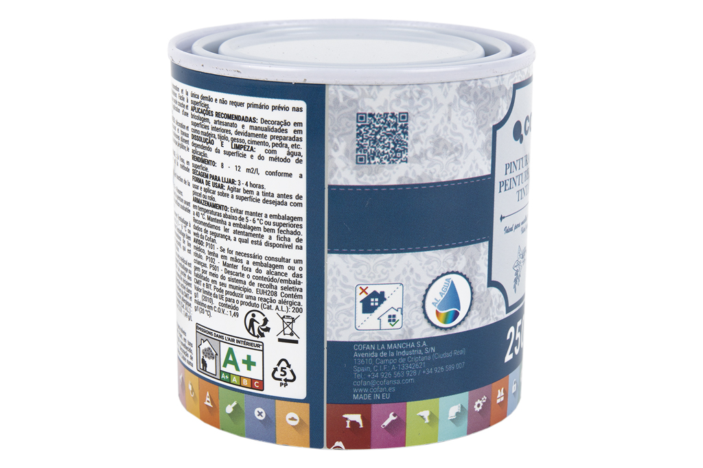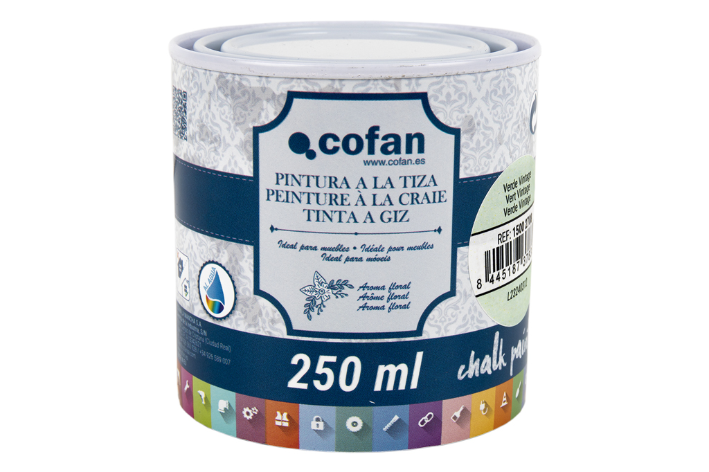 | Libellé | Cofan Peinture à la craie | Chalk paint | Finition effet à la craie | Convient pour la restauration et la décoration de meubles | Capacité : 250 ml | |