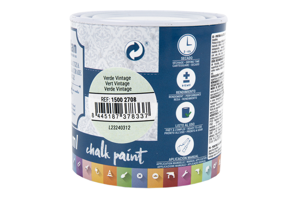 Peinture à la craie ou chalk paint spéciale pour la restauration, la rénovation et la décoration de meubles en bois. Elle fournit un fort effet craie pour donner une touche vintage à la surface. Appropriée pour l'appliquer sur les meubles et les objets d'intérieur, parce qu'elle couvre facilement la surface avec une seule couche. Elle est également idéale pour les travaux de décoration, de bricolage, d'artisanat et les travaux manuels sur des surfaces correctement préparées telles que le bois, la brique, le plâtre, le ciment, la pierre, etc. Cette peinture à base d'eau est facile à appliquer et elle ne nécessite pas d'une sous-couche pour obtenir d'excellentes finitions. Son rendement est de 8 à 12 m2/litre. Il est recommandé de bien remuer la peinture avant de l'utiliser et de l'appliquer à l'aide d'une brosse ou d'un rouleau. Vous pouvez poncer la surface une fois peinte pour créer un effet d'usure ou vieilli. Cette peinture sèche rapidement. La peinture Chalk paint est disponible en plusieurs couleurs et en différentes capacités.