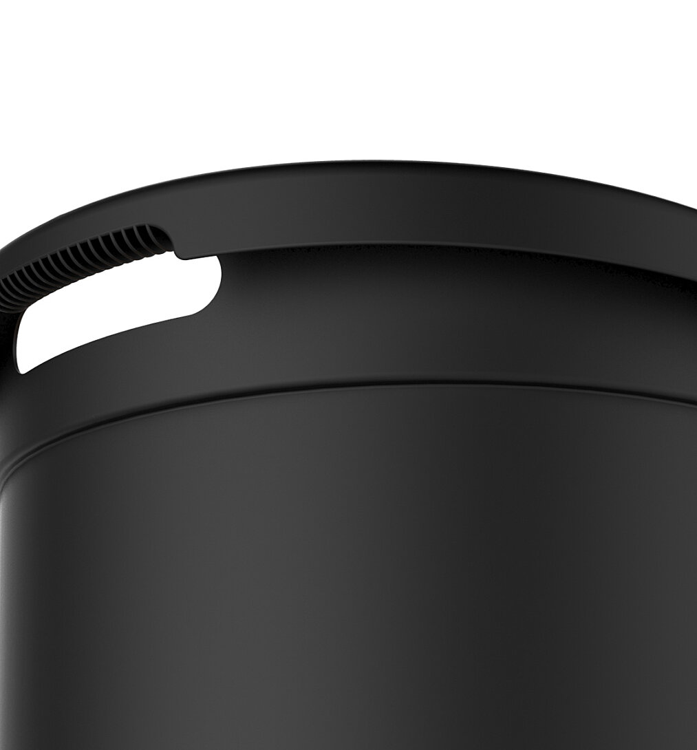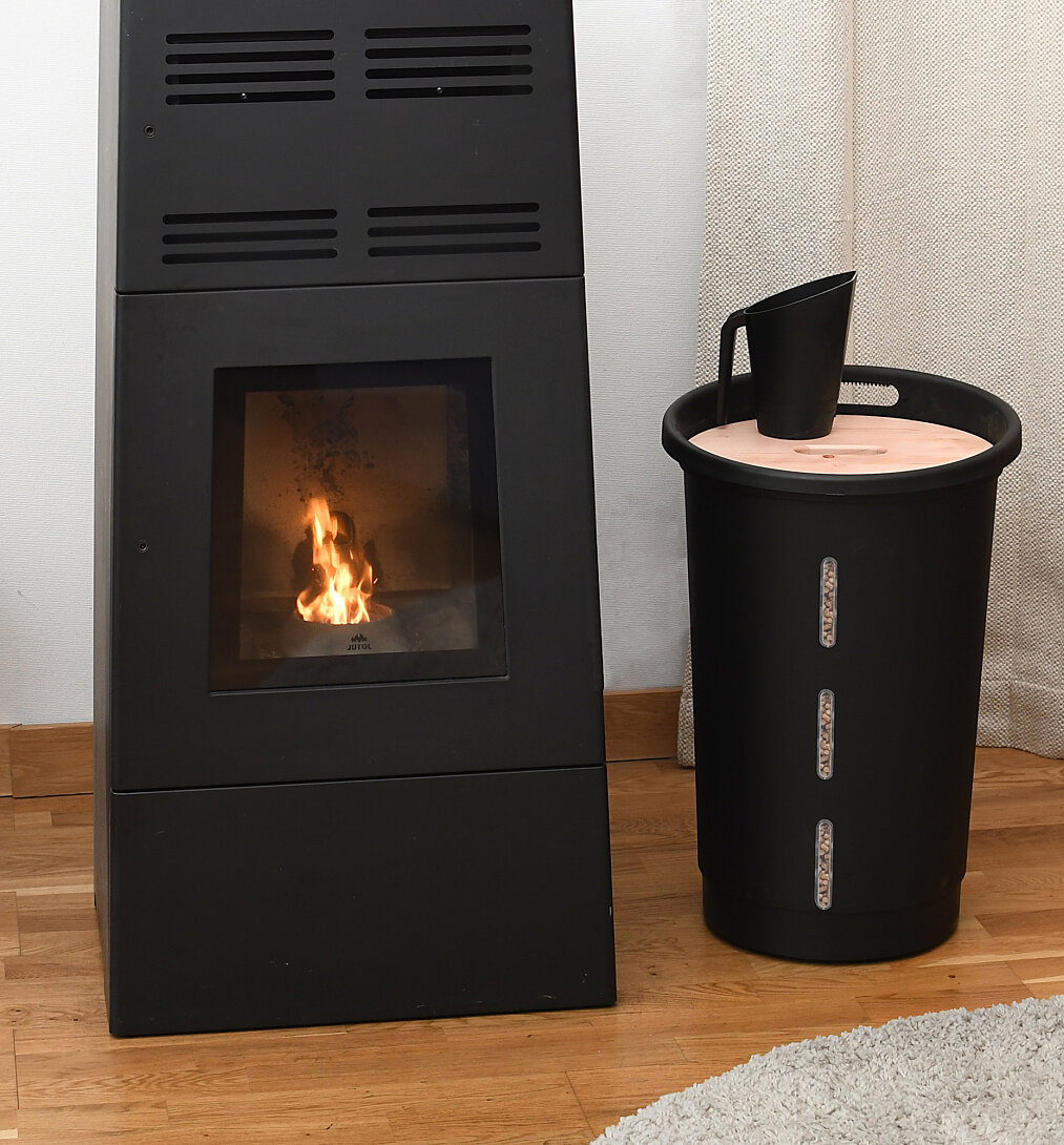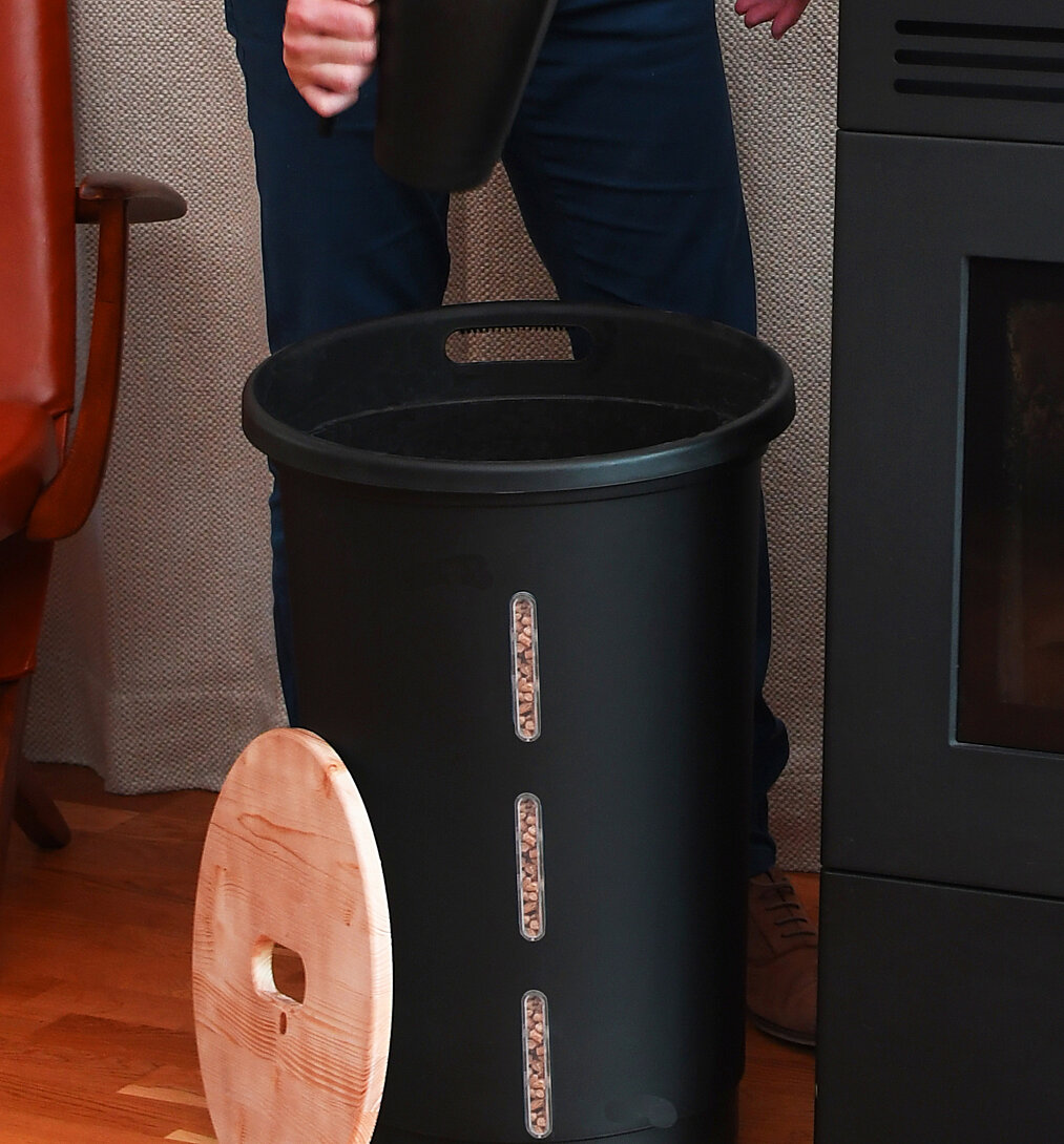 Coffre à granulés de bois avec roulettes 360° 38L capacité 25 kg Ø 39,7 x 60,5 cm Noir - Couvercle bois d'épicéa certifié PEFC