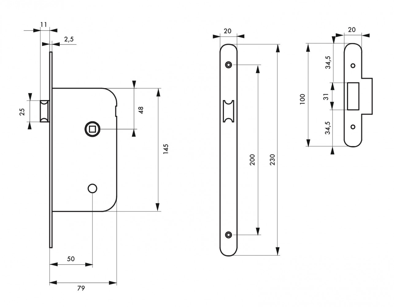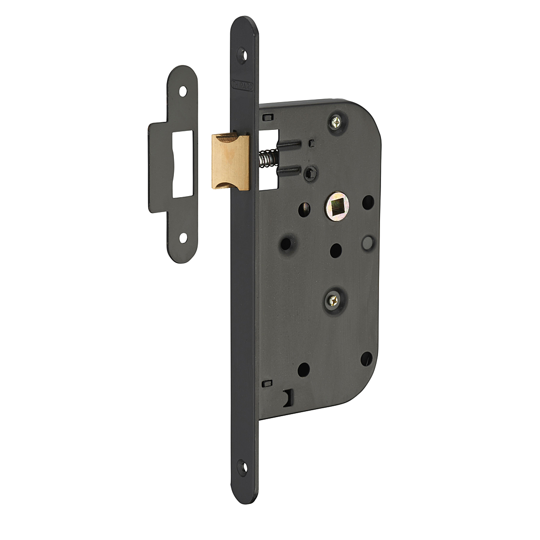 Coffre acier embouti épaisseur 11 mm. Têtière acier bouts ronds. Demi-tour alliage réversible sans démontage du coffre. Gâche plate acier. Carré 7 mm.