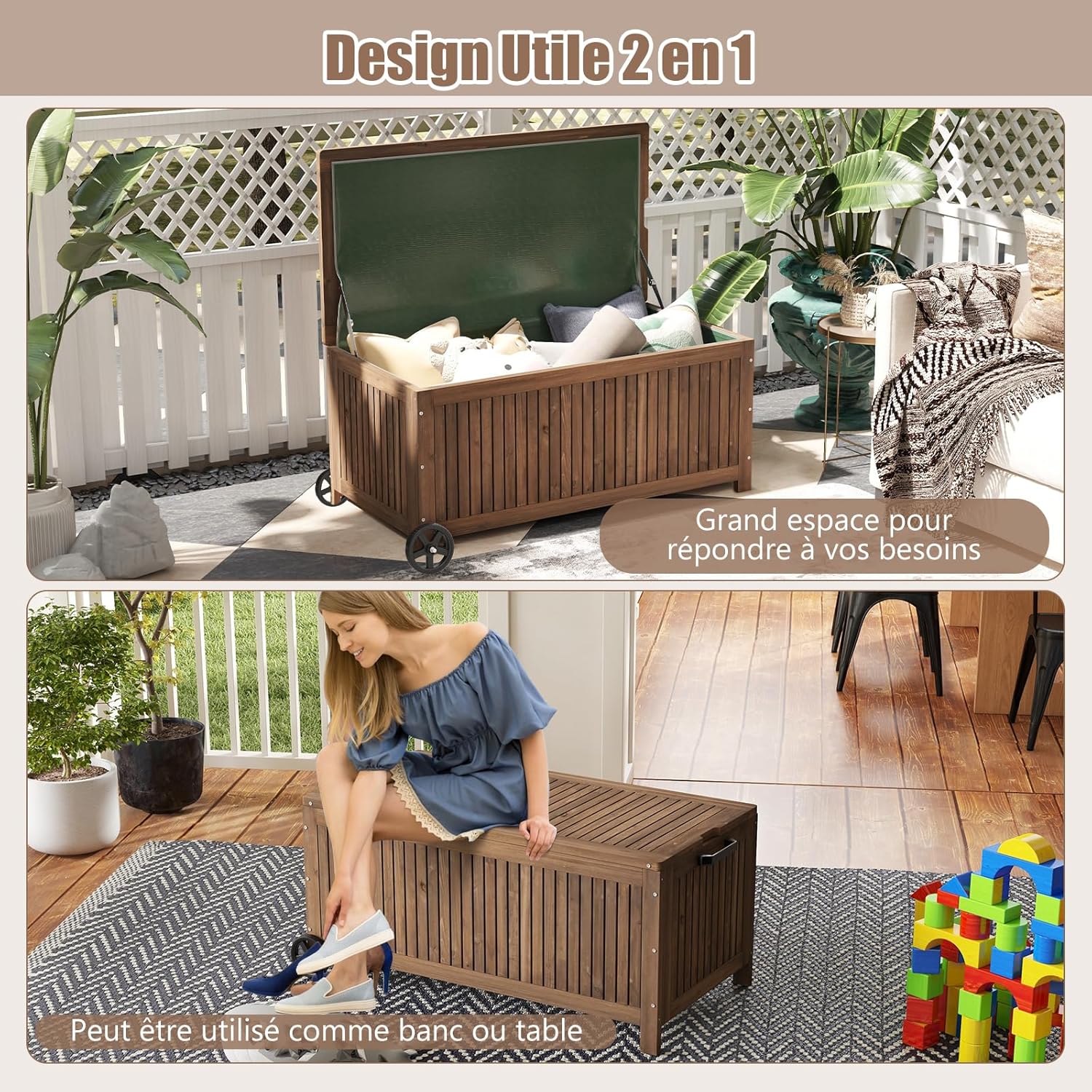 - Conception Polyvalente 2 en 1 : Alliant fonctionnalité et style, notre coffre de terrasse en bois est doté d'un design 2 en 1, lui permettant de servir également de banc ou de table. En outre, il s'intègre parfaitement à n'importe quel décor de terrasse ou de jardin, offrant facilité et polyvalence pour votre vie en plein air.
